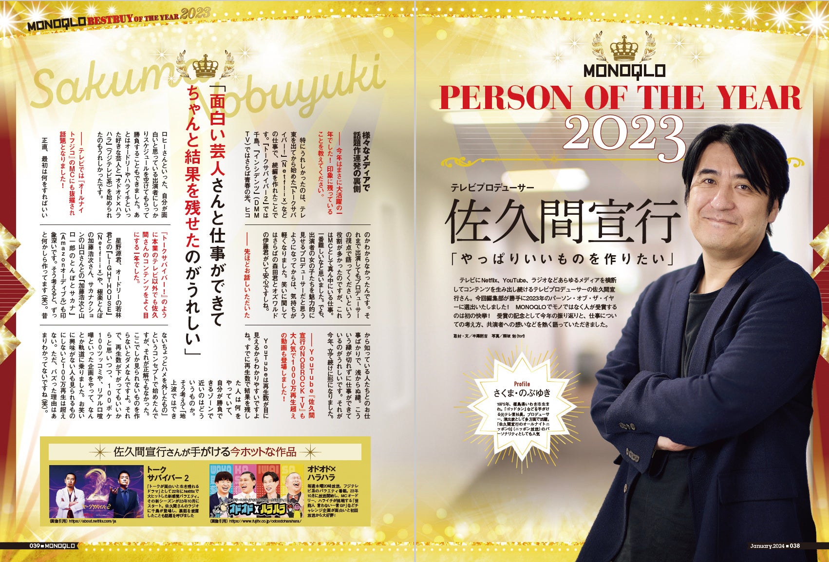 テレビにNetflix、YouTube、ラジオなどあらゆるメディアを横断してコンテンツを生み出し続けるテレビプロデューサーの佐久間宣行さん。今回編集部が勝手に2023年のパーソン・オブ・ザ・イヤーに選出いたしました! MONOQLOでモノではなく人が受賞するのは初の快挙! 受賞の記念として今年の振り返りと、仕事についての考え方、共演者への想いなどを熱く語っていただきました。