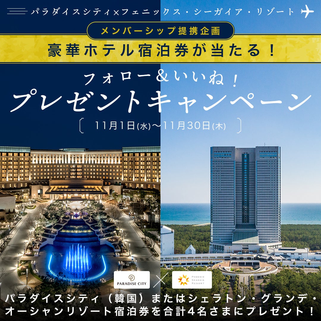 韓国のラグジュアリーでアートな空間を楽しめる「パラダイスシティ」と宮崎県の大自然を楽しめる「フェニックス・シーガイア・リゾート」がコラボ!豪華宿泊券を抽選で4組様にプレゼントいたします。