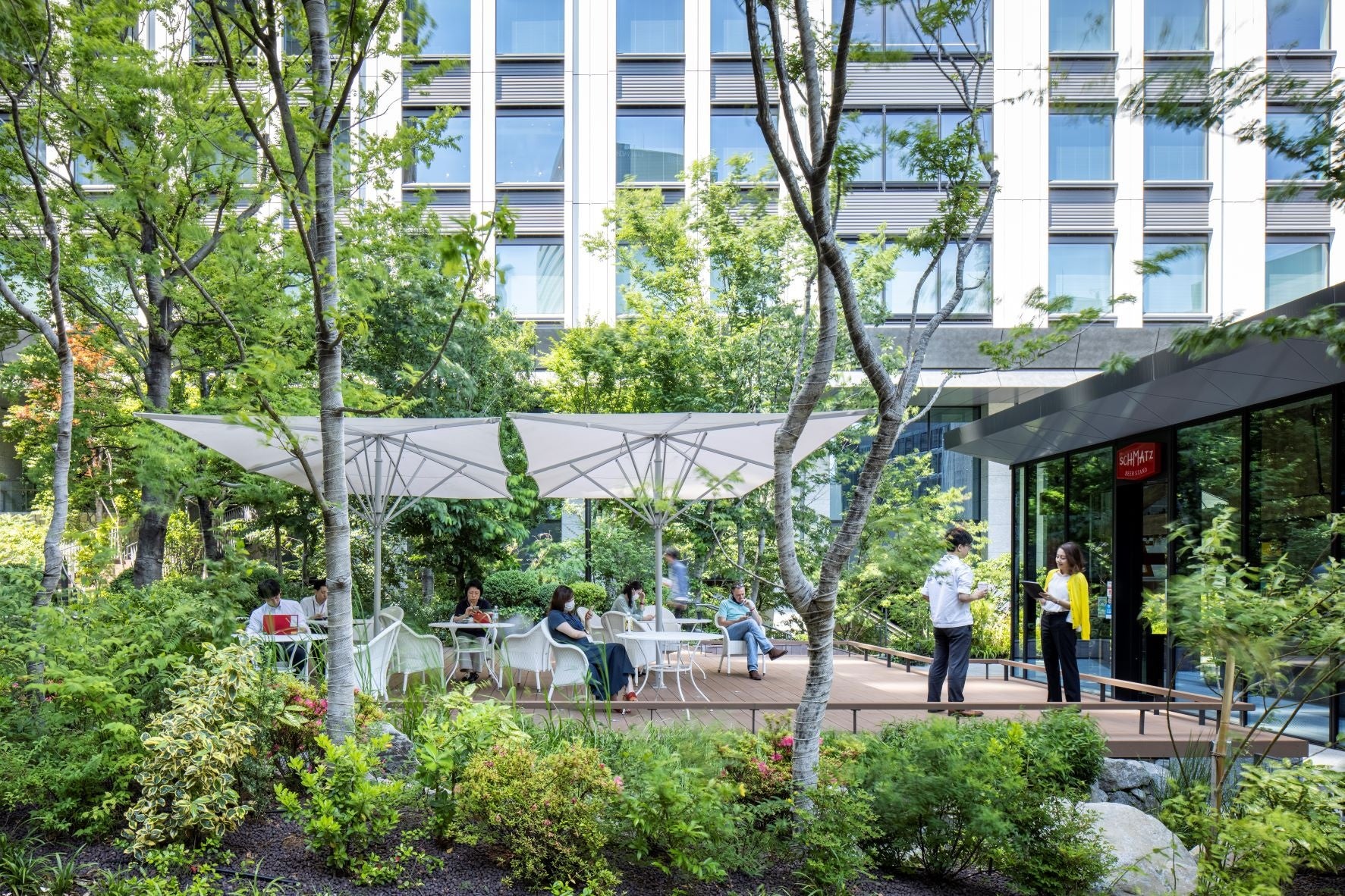 緑の中を抜ける風や光を享受でき、都会の中での健康的なパブリックスペースとなる屋外テラス。テラスの脇にはビオトープから続く小川が流れ、せせらぎと鳥の声に包まれた居心地の良い滞留空間を形成。
