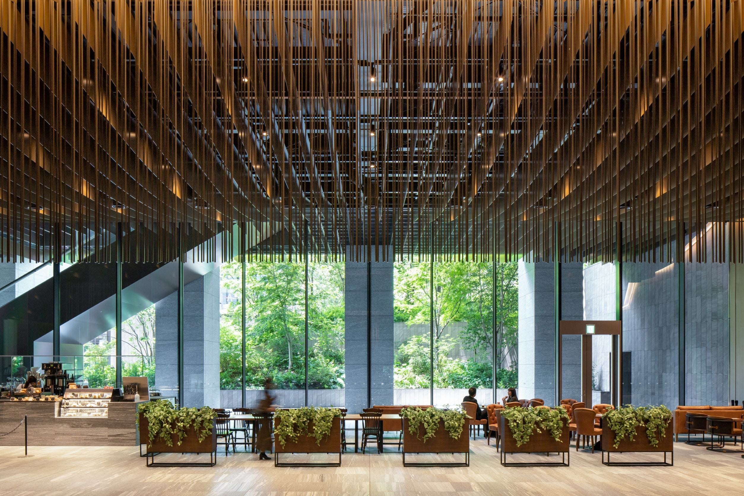 オフィスエントランスからは登り庭を望むことができる。3Dモデルを用いた日照シミュレーションや見え方のスタディを丁寧に行うことで、緑の気持ちよさを享受でき落ち着きのある滞留空間を創出。