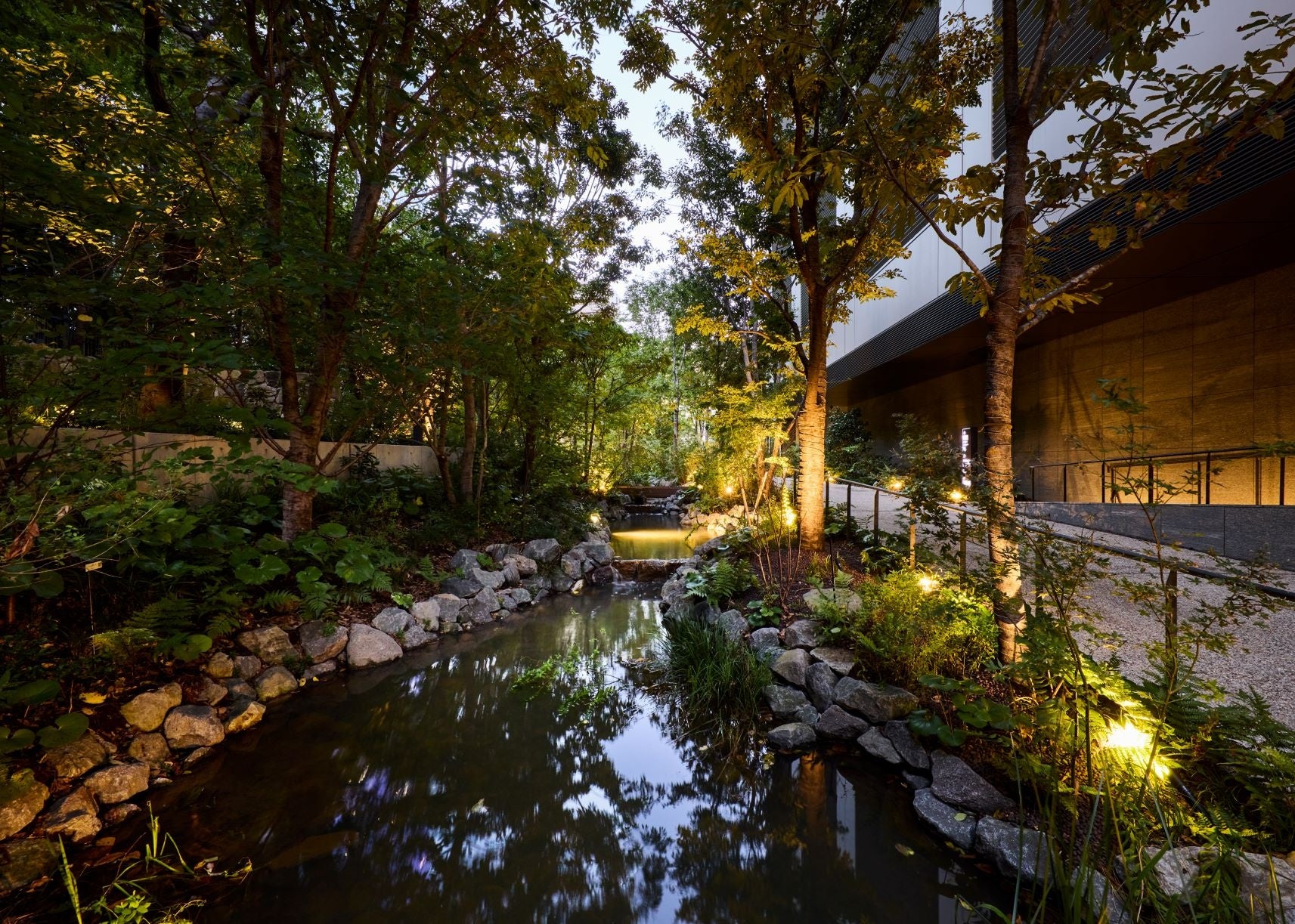 流れの幅の強弱や水際にひだのようなエコトーンをつくり出すことで、多様な棲息環境を形成。建物の地下ピット雨水貯留槽で、地中熱を利用し緩やかに冷やした雨水を循環させ、エネルギー負荷を低減。