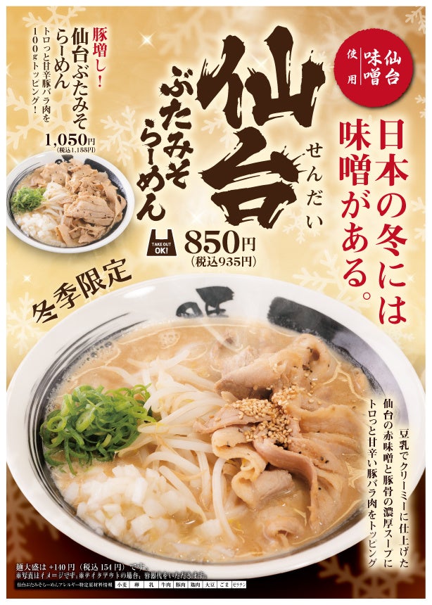 もっとガッツリ味わいたいお客様には、甘辛な豚バラ肉を倍量(100g)もドカンとトッピングした「豚増し! 仙台ぶたみそらーめん」がおすすめです。一部店舗では持ち帰りにも対応していますので、ご自宅や職場でもお楽しみいただけます。