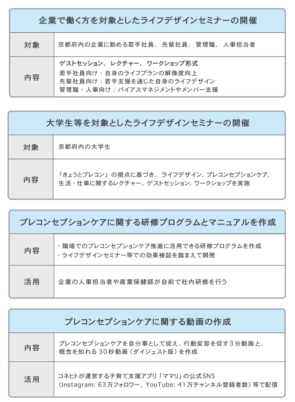 本事業は、日本旅行とコネヒトの共同企業体で推進します。日本旅行の京都企業・学校とのネットワークと、コネヒトのプレコンセプションケア領域における企画力・実績を活かし、以下の取り組みを実施します。