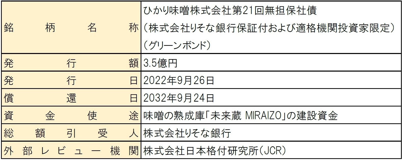 ひかり味噌󠄀株式会社(長野県諏訪郡下諏訪町、代表取締役社長 林 善博)は、2022年9月26日「グリーンボンド※(私募債)」を発行いたします。本グリーンボンドにより調達する資金は、2022年7月に稼働開始した味噌󠄀熟成庫「未来蔵 MIRAIZO」の建設資金として活用いたします。「未来蔵 MIRAIZO」は、高い断熱効果のある建屋で高効率な空調管理を行い、CO2フリー電気である「信州Greenでんき」を活用するなど、環境に配慮した最新鋭の設備です。