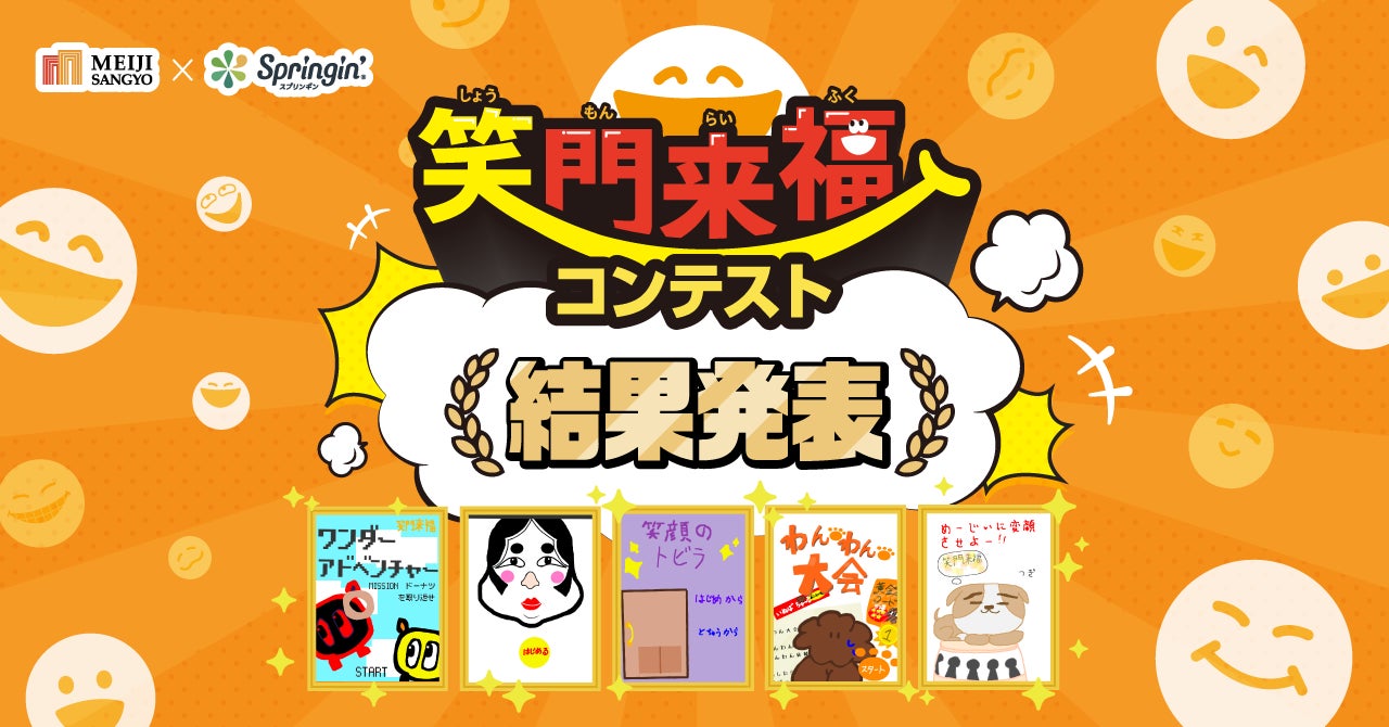 株式会社しくみデザイン(本社:福岡県福岡市博多区、代表取締役:中村俊介、以下「しくみデザイン」)は、ガスや電気など、住宅関連サービスを通じて暮らしに笑顔を生み出している株式会社明治産業(福岡県福岡市中央区/代表取締役 明永喜年)とともに、2022年10月3日(月)~11月30日(水)の期間にて、「笑門来福(しょうもんらいふく)コンテスト」を開催。本コンテストでは、暮らしに笑顔を生み出し続ける明治産業にちなみ、誰かを笑わせて幸せになれる楽しい作品を、「スプリンギン」にて募集しました。そしてこの度、応募作品数約400個の中から最も笑いと幸せが生んだ作品が決定しましたのでお知らせします。