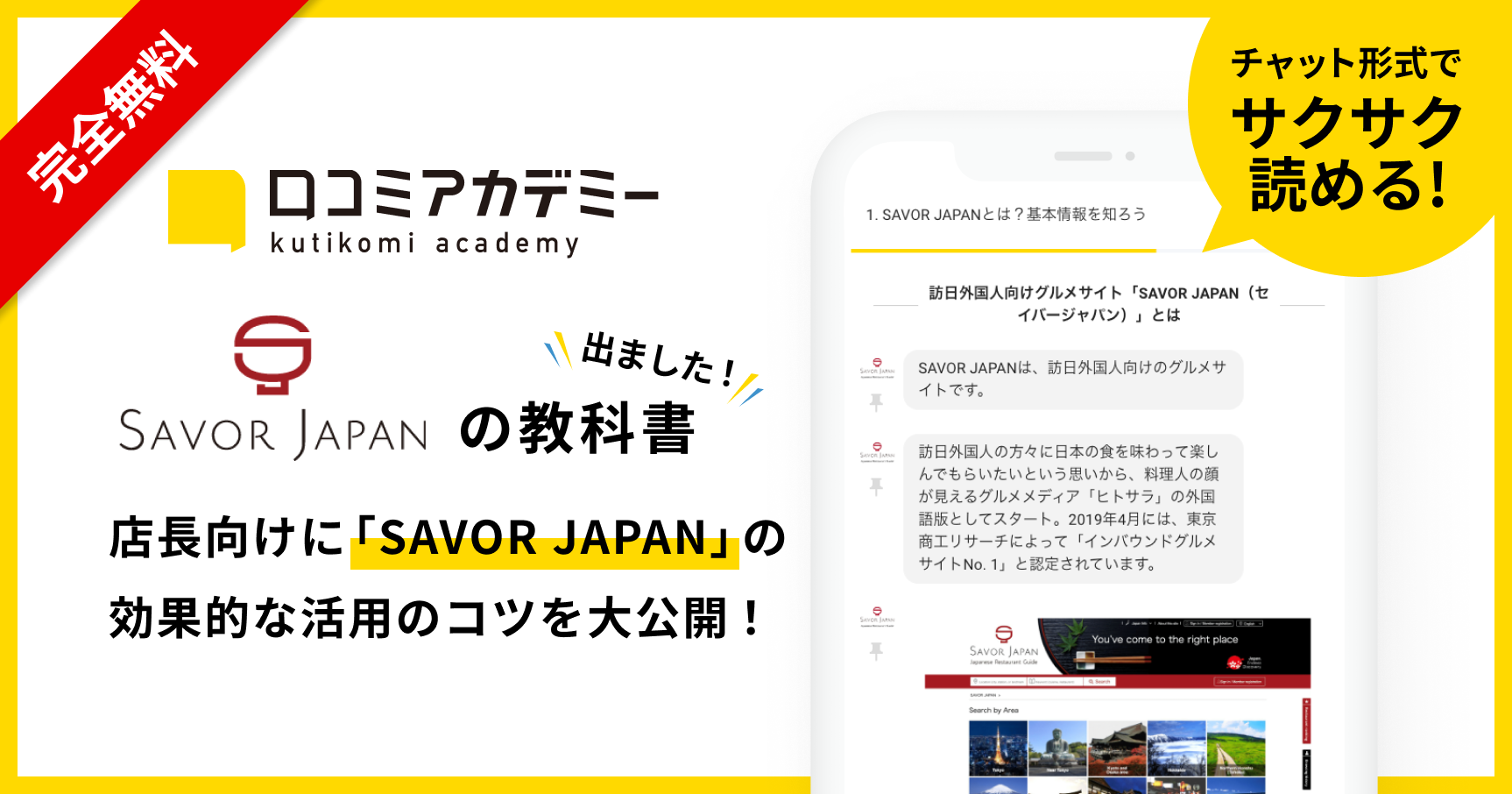 今回「口コミアカデミー」で公開した「SAVOR JAPANの教科書」では、SAVOR JAPAN公式監修の元コンテンツを製作。「SAVOR JAPAN」の特徴や、効果的な使い方についてわかりやすく解説します。