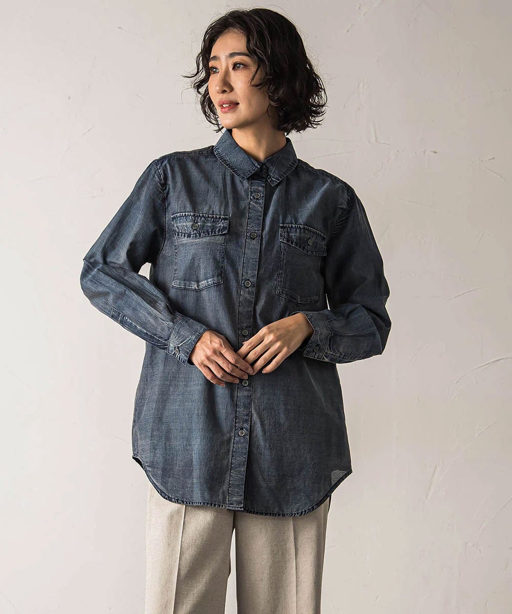 シアー感が夏らしく清涼感のある薄手デニム素材のシャツ。カジュアル感のあるワークポケットデザインでラフなオトナカジュアルスタイルが完成