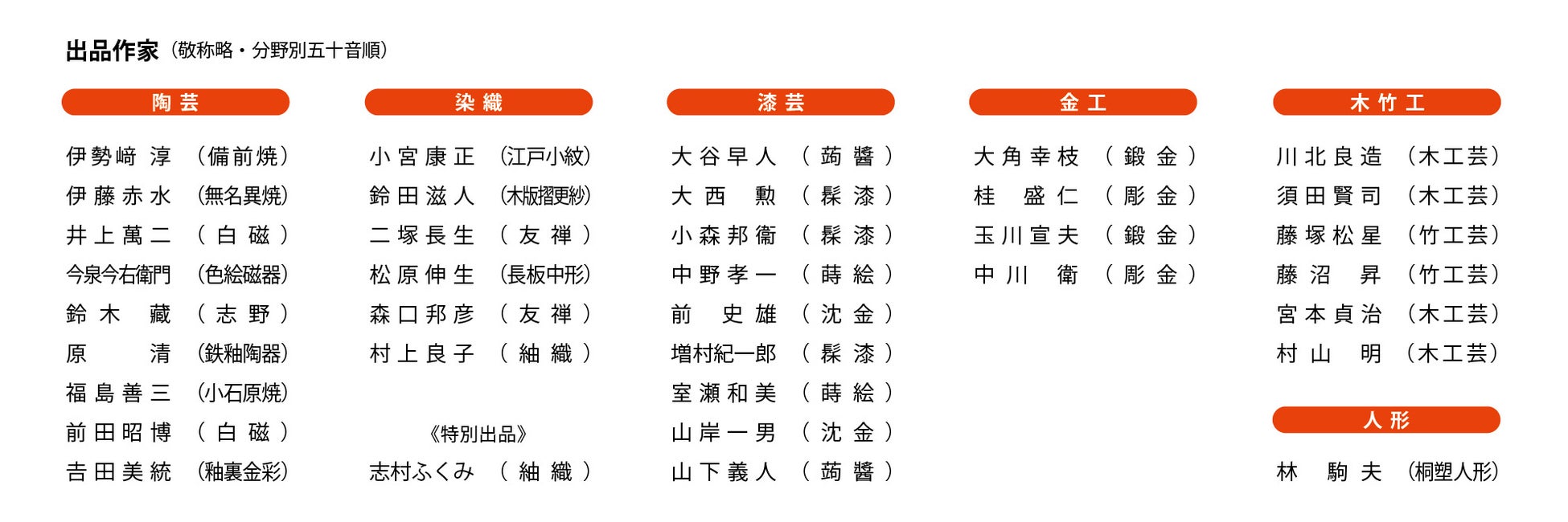 陶芸・染織・漆芸・金工・木竹工・人形の6つの工芸分野の重要無形文化財保持者(人間国宝)36名が出品。