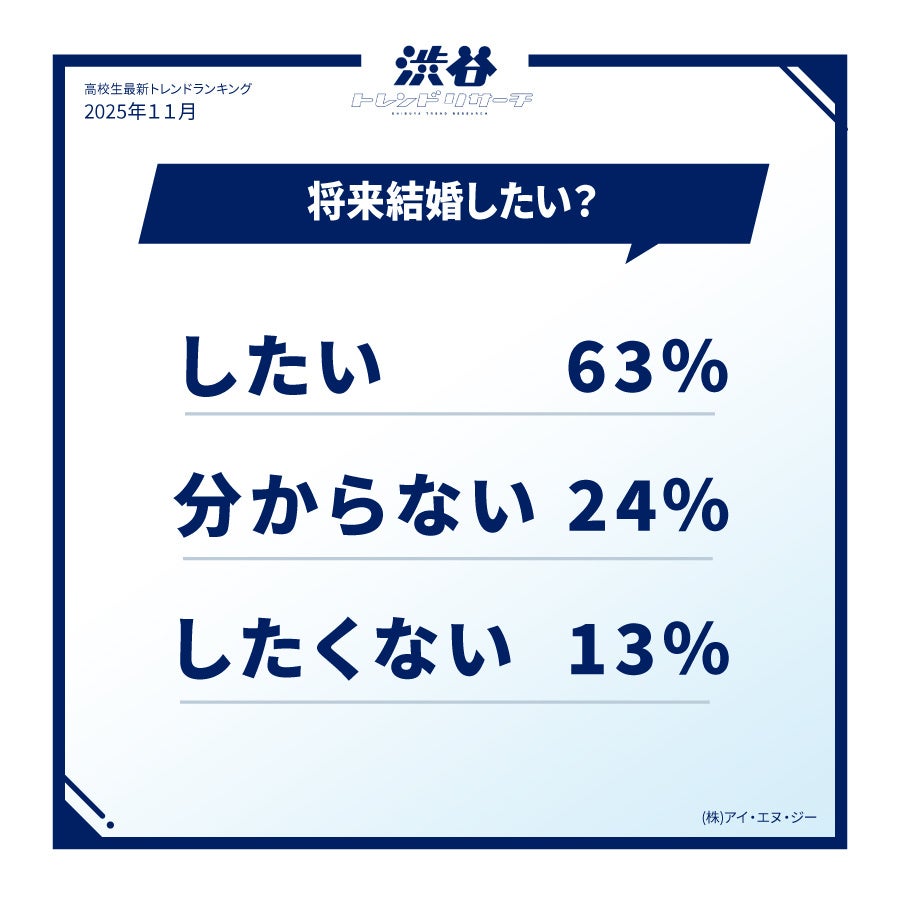 結婚願望がある高校生は63%という結果に。昨年の同調査では77%が「結婚したい」と回答しており、結婚願望を持つ高校生は減少傾向にあることがうかがえます。「結婚は憧れるけど、恋愛したことがないからイメージがわかない」(高1・女子)といった声のほか、「離婚する人が多いから」(高3・男子)といった意見も見られ、結婚に対する憧れはある一方で、実際の結婚生活へのイメージをポジティブに持ちきれない高校生も多いようです。