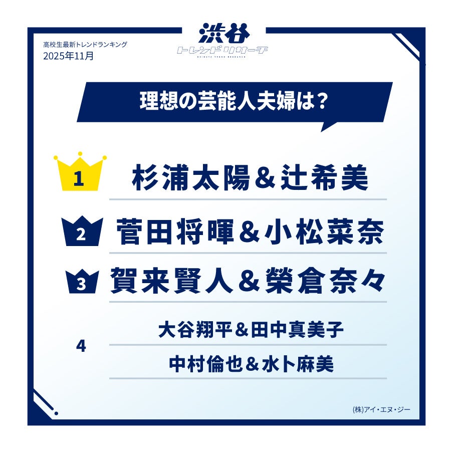 憧れの芸能人夫婦として1位に選ばれたのは、今年8月に第5子を出産した「杉浦太陽&辻希美」夫妻。「何年たってもラブラブだから」(高1・女子)、「家族・夫婦ともに仲良しで、見ていて幸せそう」(高3・女子)などの声が多数寄せられ、YouTubeやSNSで見られる大家族の仲睦まじい様子に憧れる高校生が多いようです。2位には、本ランキング常連の「菅田将暉&小松菜奈」夫妻がランクイン。「『溺れるナイフ』で好きになって、2人の雰囲気がすごく好き」(高2・女子)、「2人にしか出せない独特の空気感がかっこいい」(高1・男子)といったコメントが寄せられ、2人のオーラや世界観に魅力を感じている様子がうかがえます3位には結婚9年目を迎えた「賀来賢人&榮倉奈々」夫妻がランクイン。「インスタのストーリーとかでも、お互い支え合っているのが伝わってくる」(高1・女子)、「おもしろくて大好き」(高2・女子)など、自然体で仲の良い様子が支持を集めました。