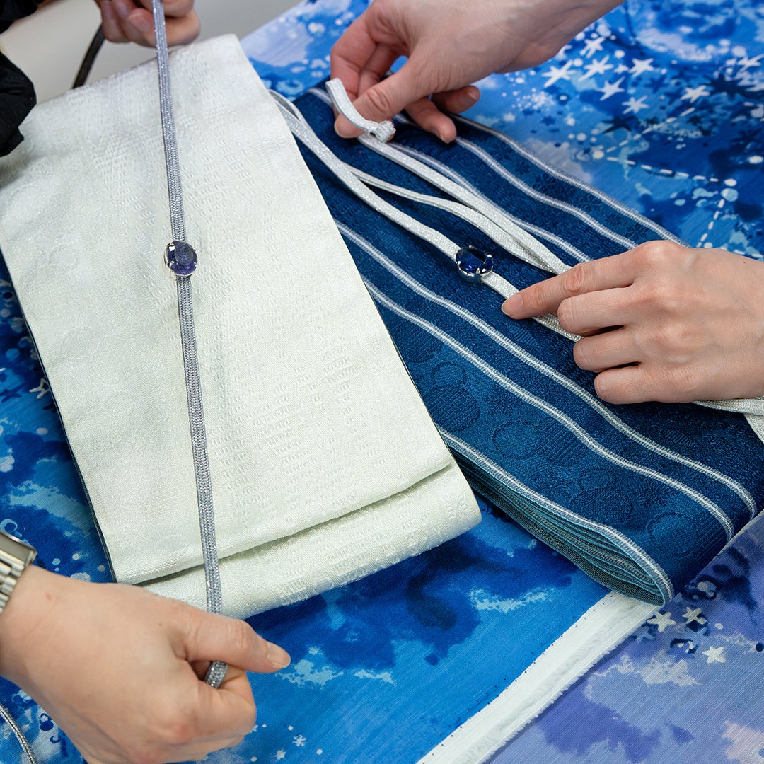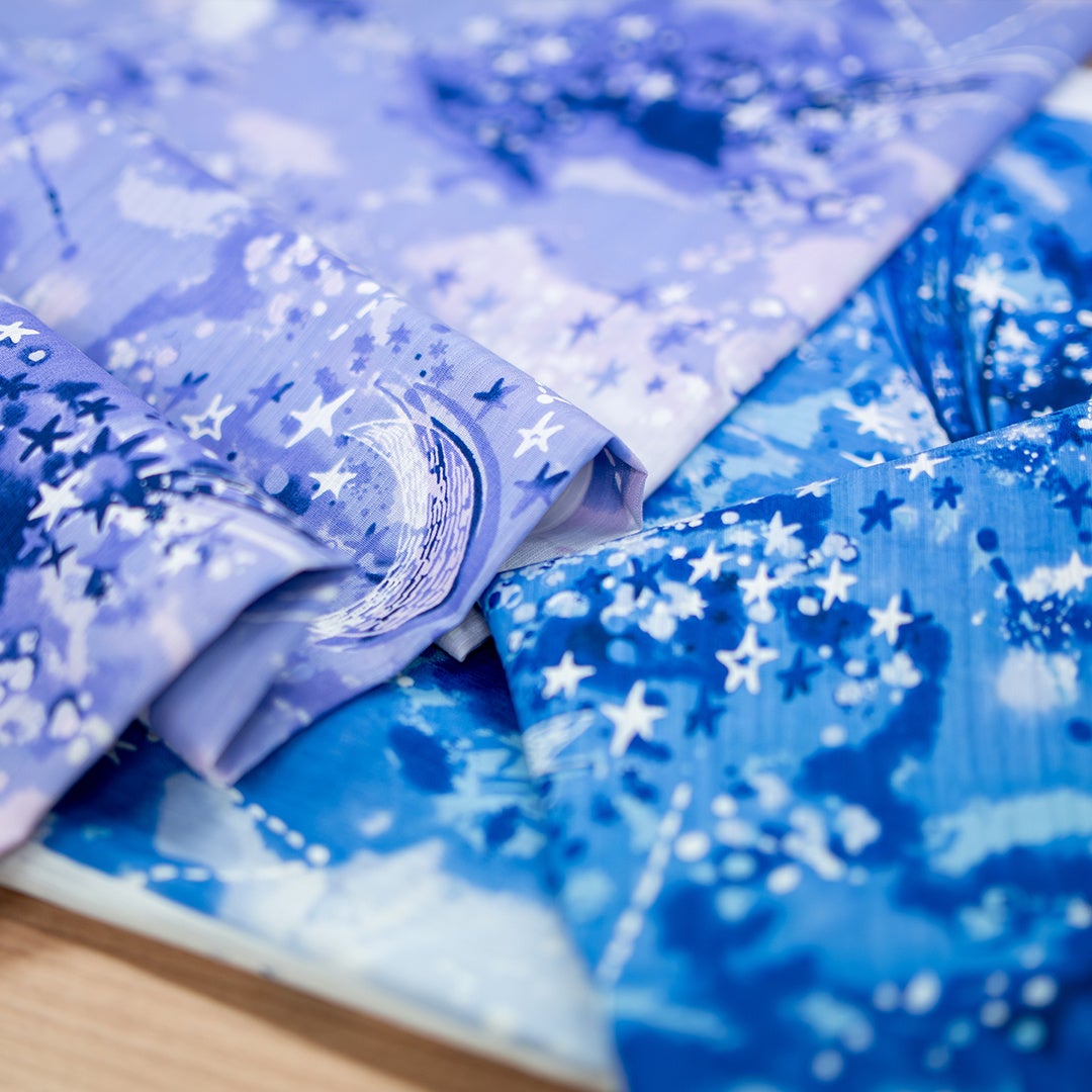 今年は、ブランド初期から検討されてきた新モチーフ「星空」がついに登場しました。 濃淡を見せる夜空のような複雑な色の地に、星々や月、星座線が細やかに表現されています。「Made in Japan」の高い染色技術により、青や紫、ピンクといった色が濁りなく鮮やかに発色しています。