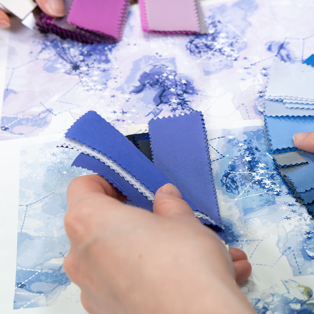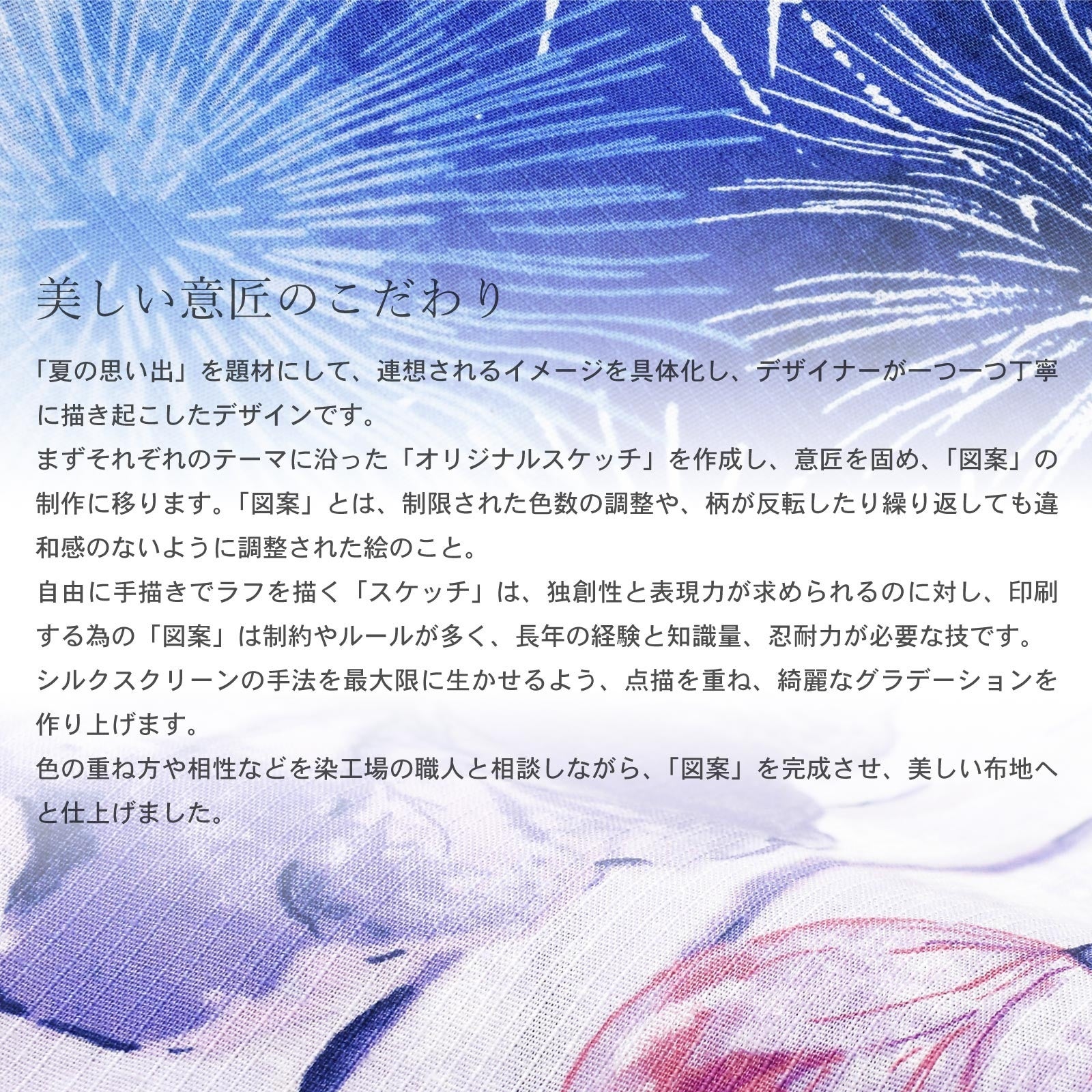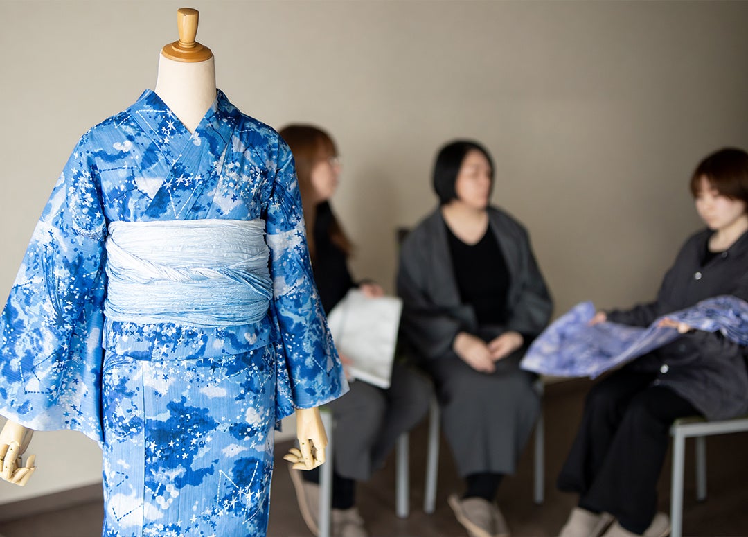 浴衣図案は、創業130年を迎える日本メーカーとタッグを組んで作成しました。題材から連想されるイメージを具体化し、デザイナーが一つ一つ丁寧にデザインを描き起こしています。シルクスクリーンの手法を最大限に生かせるよう、点描を重ね、綺麗なグラデーションを作り上げます。色の重ね方や相性などを染工場の職人と相談しながら美しい布地へと仕上げました。