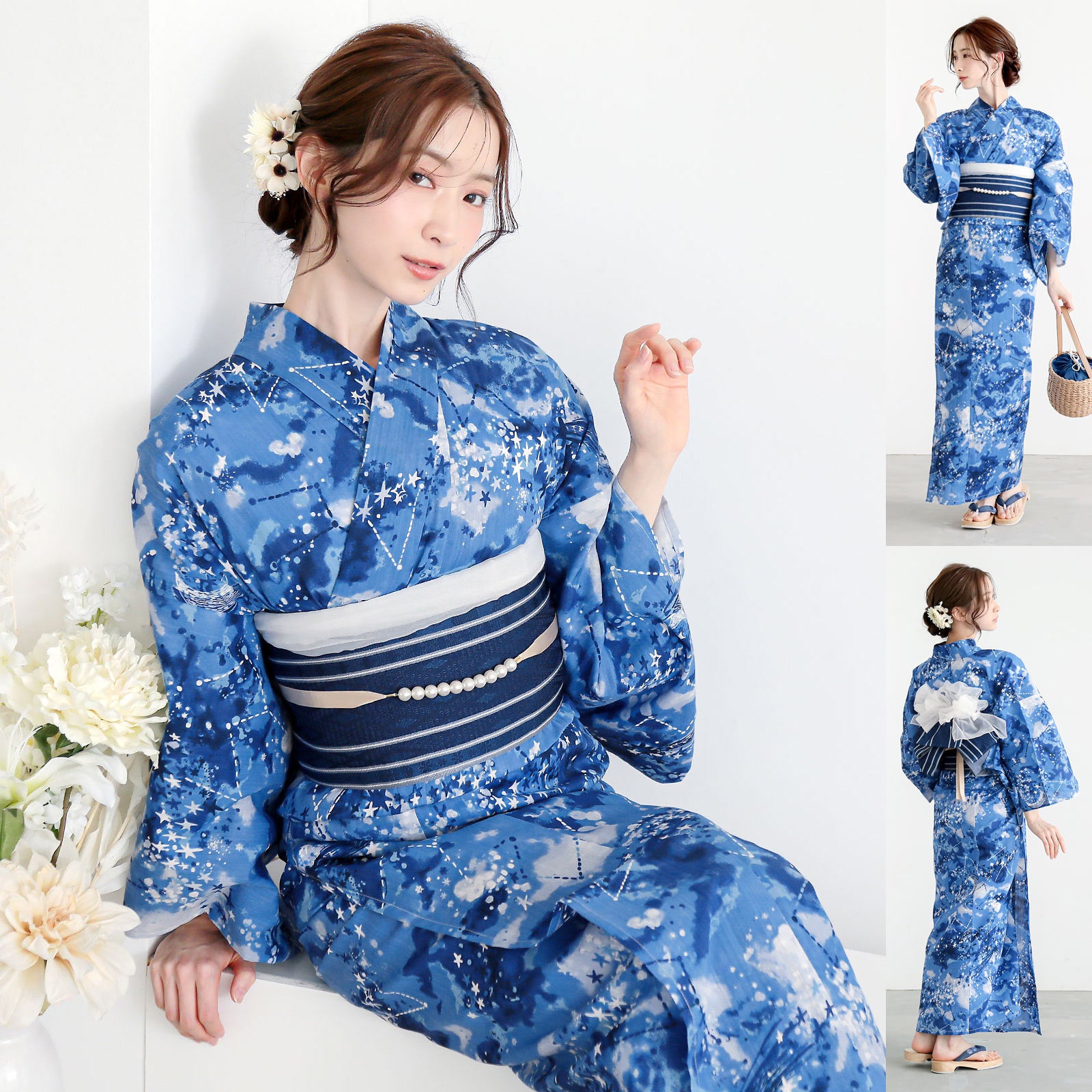 淡い群青色に濃淡のあるネイビーのぼかし。白や濃紺、浅い空色の線で表現された手描き調の月や星に星座線。夏の夜、見上げた空いっぱいに輝く天の川や星座を思わせる浴衣です。