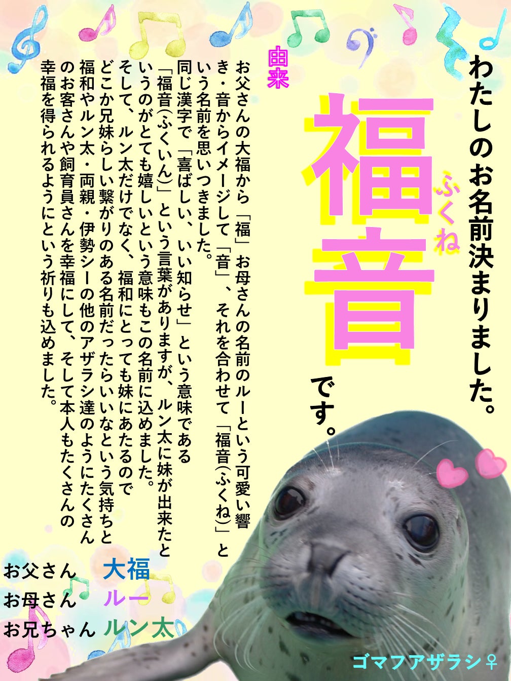 そして、ルン太だけでなく、福和にとっても妹にあたるので、どこか兄妹らしい繋がりのある名前だったらいいなという気持ちと、福和やルン太・両親・伊勢シーの他のアザラシ達のようにたくさんのお客さんや飼育員さんを幸福にして、そして本人もたくさんの幸福を得られるようにという祈りも込めました。