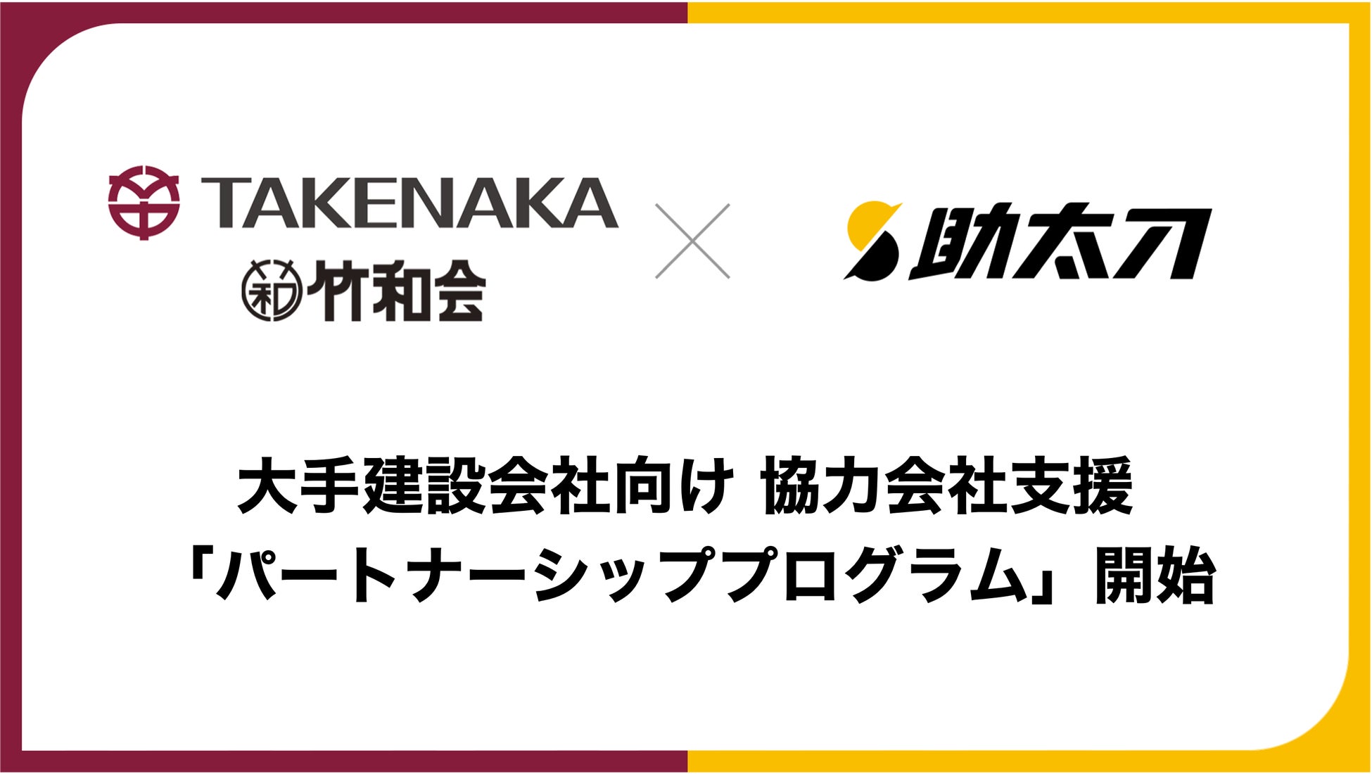 21万超の建設事業者が利用する建設人材マッチングプラットフォームを運営する株式会社助太刀(所在地:東京都新宿区、 代表取締役社長 兼CEO:我妻陽一、以下「当社」)による、大手建設会社向け協力会社支援「助太刀パートナーシッププログラム」が開始し、第1号案件として株式会社竹中工務店(所在地:大阪府大阪市、取締役社長:佐々木正人、以下「竹中工務店」)が導入したことをお知らせいたします。