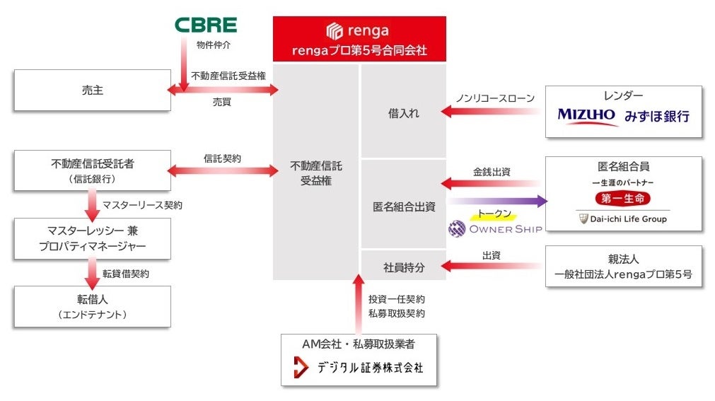 デジタル証券及びその子会社であるオーナーシップ株式会社(本社・東京都港区、代表取締役 松井晴彦、以下OS社)は、デジタル証券が「rengaプロ第5号合同会社」を設立したうえで、OS社が開発した不動産セキュリティ・トークン・オファリング(不動産STO)システム上で同社への匿名組合出資持分をブロックチェーン技術により電子化することにより、プロ向けの不動産STOファンドを組成しました。当該ファンドに対しては、第一生命保険株式会社が全額出資し、株式会社みずほ銀行がノンリコースローンを提供しています。