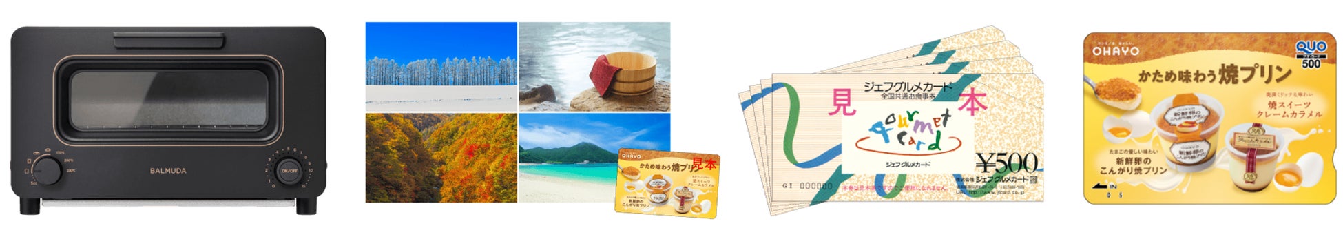 抽選で総計1,000名様に、バルミューダ社の高級トースター「バルミューダ ザ・トースター」、JTBトラベルギフト、シェフグルメカード、オリジナルデザインQUOカードをプレゼントいたします。(応募要項は次頁参照)。