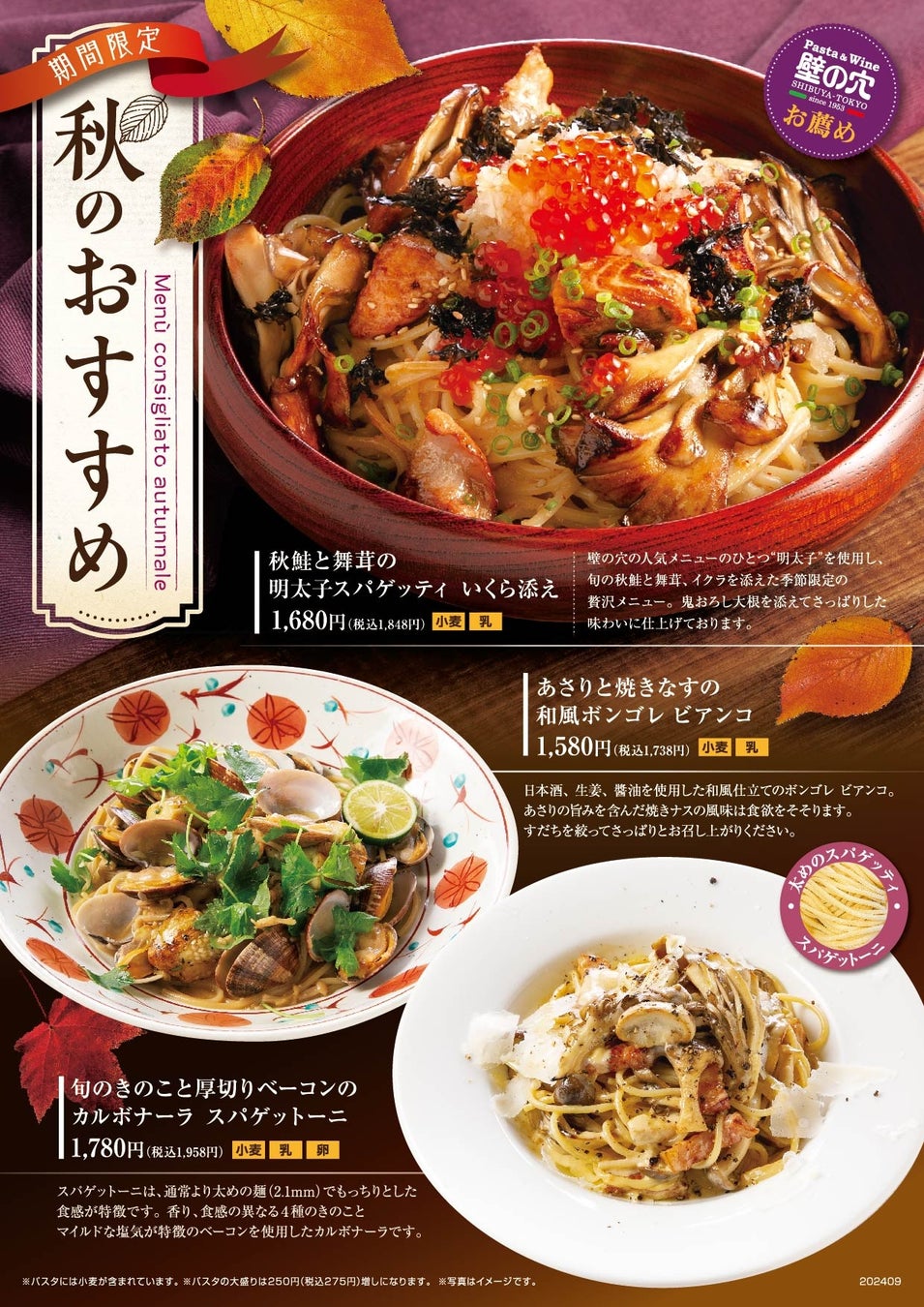スパゲッティ専門店「壁の穴」では秋の旬な味覚をたっぷり添えた“和風スパゲッティ”3種類を9月18日(水)より期間限定で販売いたします。さっぱりした味わいが特徴の「秋鮭と舞茸の明太子スパゲッティ いくら添え」に秋にぴったりの和風仕立ての「あさりと焼きなすの和風ボンゴレ ビアンコ」そして、通常より太めの麺(2.1mm)のスパゲットーニ(※)を使用したもっちりした食感「旬のきのこと厚切りベーコンのカルボナーラ スパゲットーニ」でございます。どのメニューも秋の澄んだ空気感の中で際立つ香り、風味、そしてアルデンテ(※)な食感のスペシャルメニューでございます。この機会に是非ご利用ください。皆さまのご来店をスタッフ一同お待ちしております。