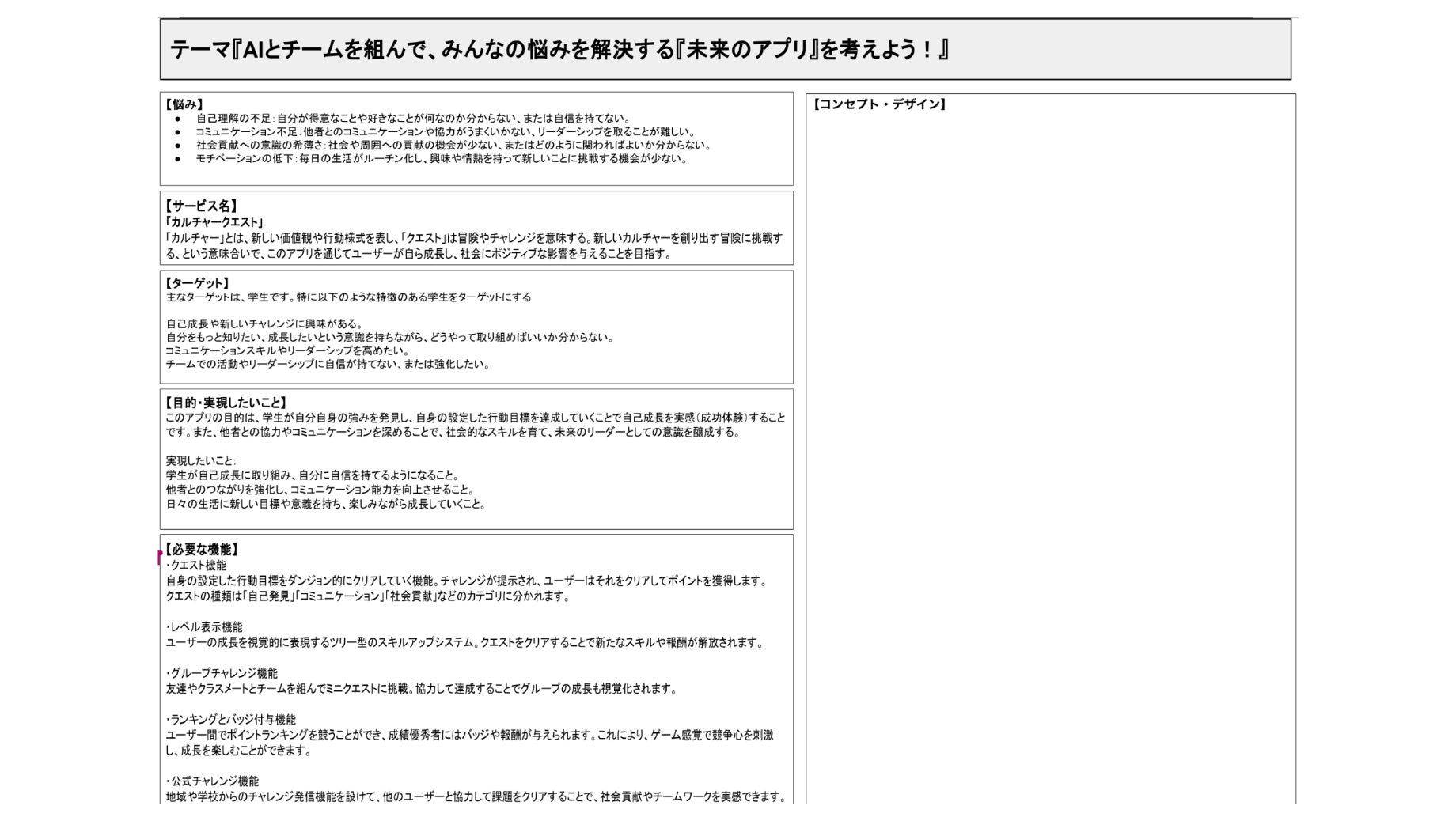 この度、教育活動の一環として未来を担う生徒の育成を目的に、中学生向けの生成AIワークショップを開催しました。本ワークショップでは、生成AIの基本的な知識を習得するだけでなく、実際の活用方法について探求し、自分たちのアイデアを活かした未来のアプリの構想にも挑戦しました。