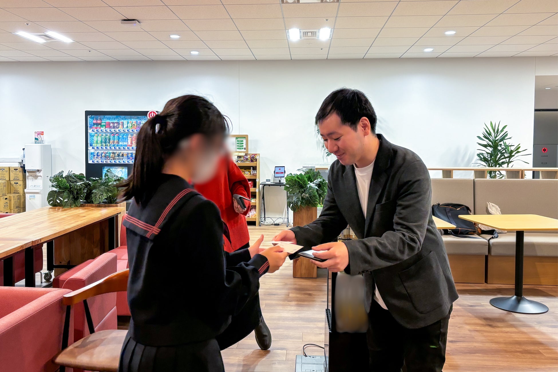 生徒たちの希望で、社会人としての第一歩となる名刺交換の練習も行いました。生徒たちは、名刺を受け渡す際の基本的なマナーや礼儀について学び、実際のビジネスシーンを体験する貴重な機会となりました。