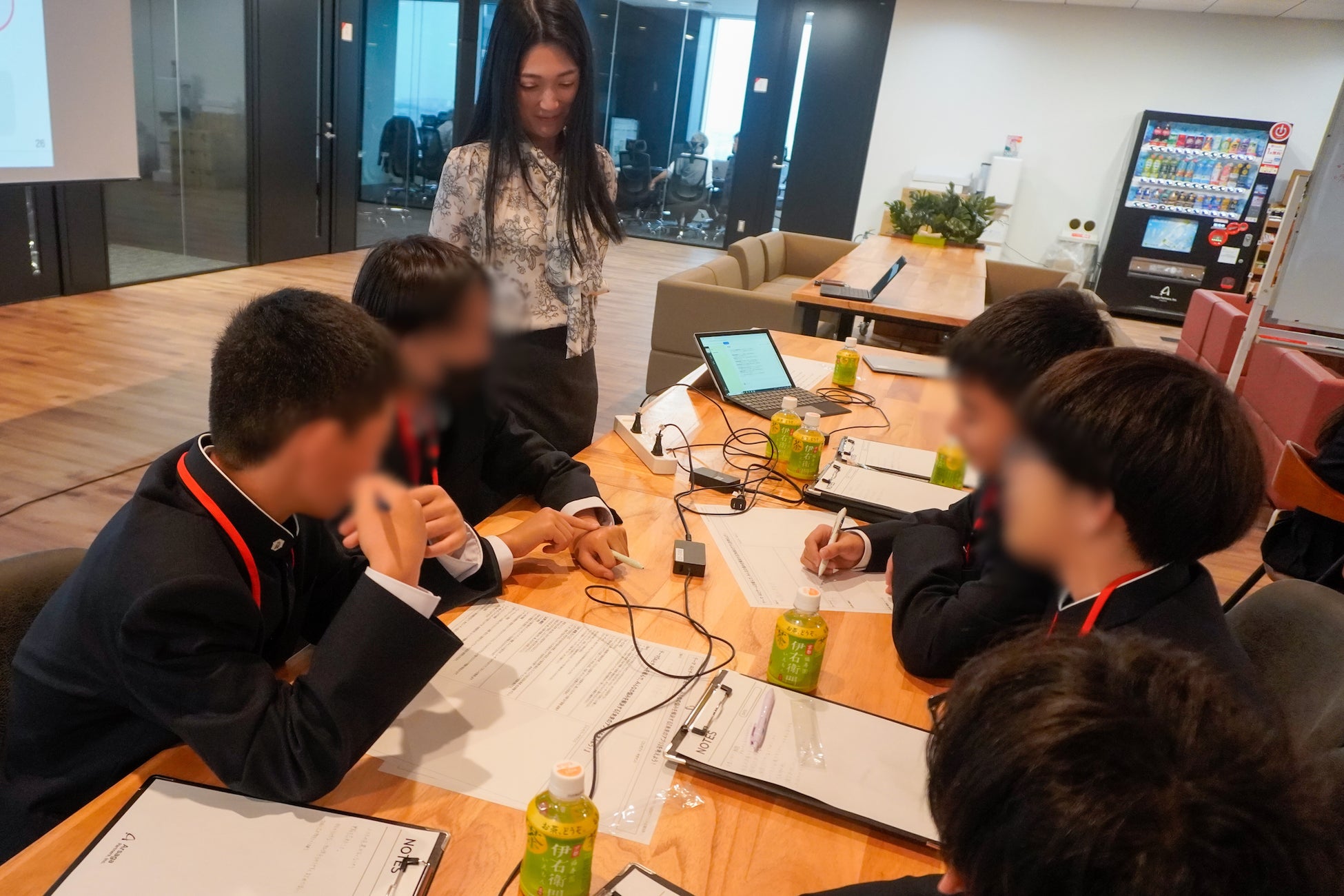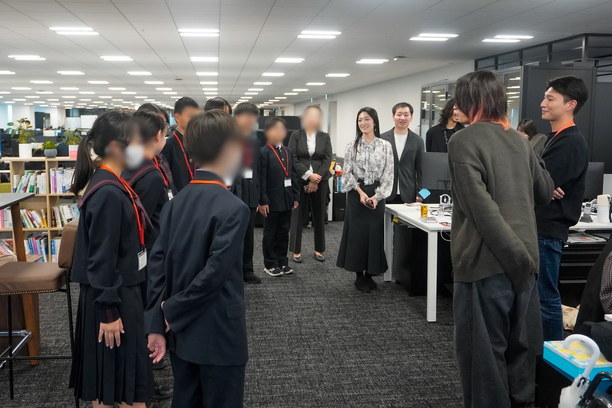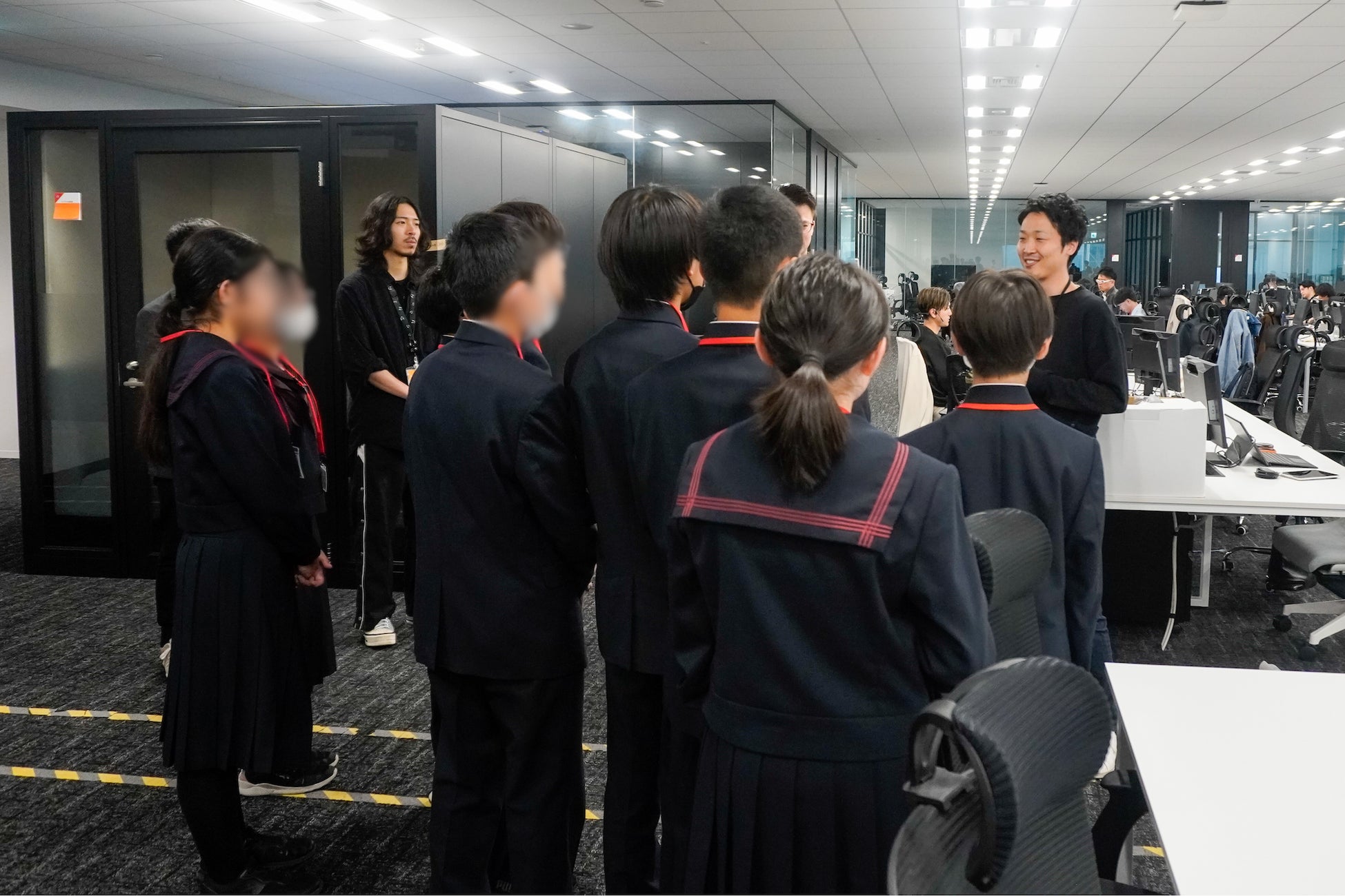 オフィスや開発現場を見学し、社員の日常業務や働く環境について触れました。開発エンジニア、QAエンジニア、コンサルタントなどのメンバーが、それぞれの仕事や役割を説明すると、生徒たちは興味深く耳を傾けていました。異なる職種の連携や業務の進め方について知ることで、仕事の魅力や現場の雰囲気をより深く感じ取る様子が見られました。また、普段訪れる機会が少ないオフィスの雰囲気を体感することで、生徒らに職場の空気を味わってもらいました。