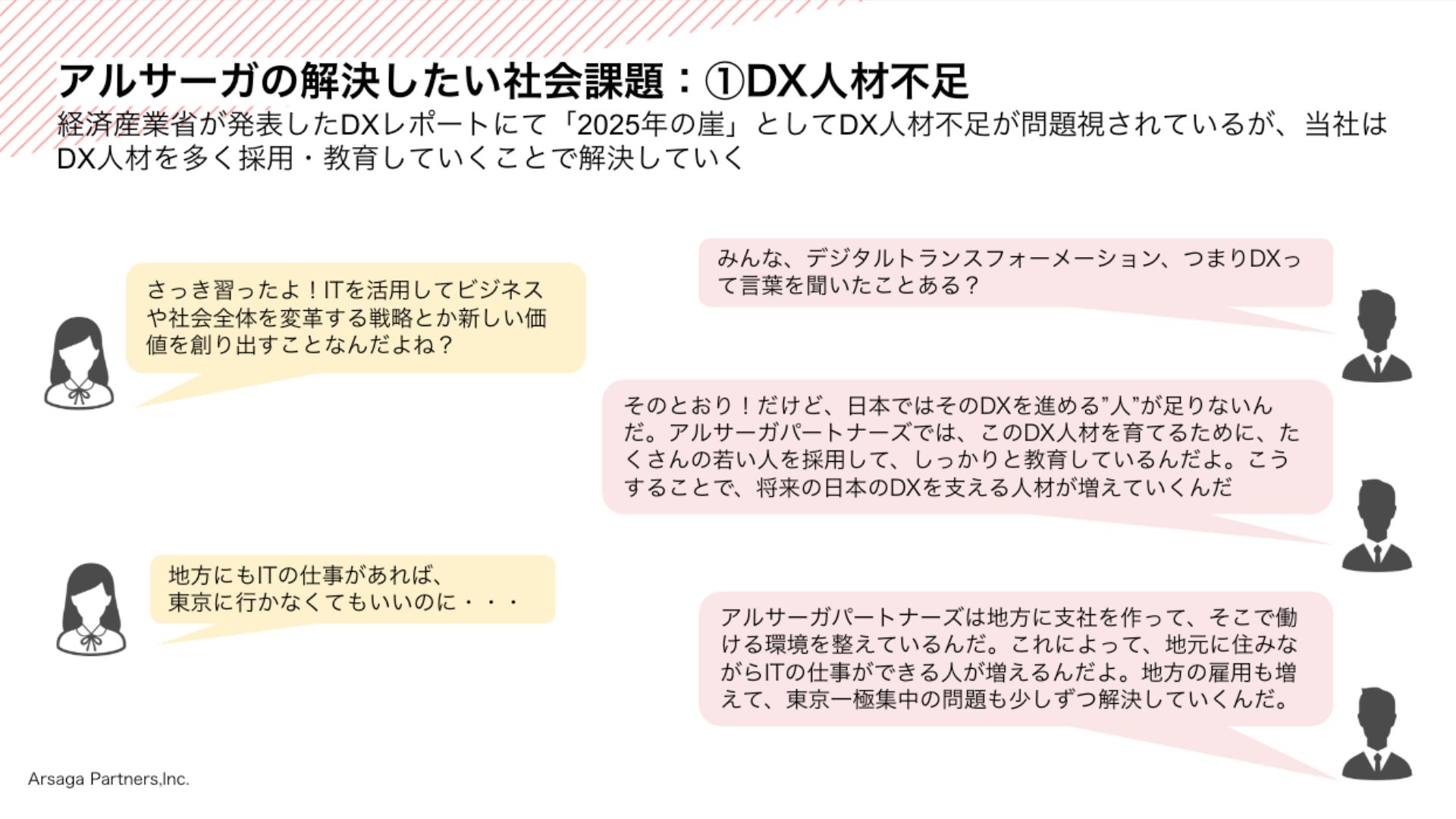 まず、ITとDXについて理解してもらうために、身近なアプリを用いて「DXとは何か?」について話しました。その後、アルサーガパートナーズについて紹介し、会社が目指すビジョンや解決したい社会課題である「DX人材不足」「地方格差・東京一極集中」などについて、イラストを使った会話形式でお伝えしました。
