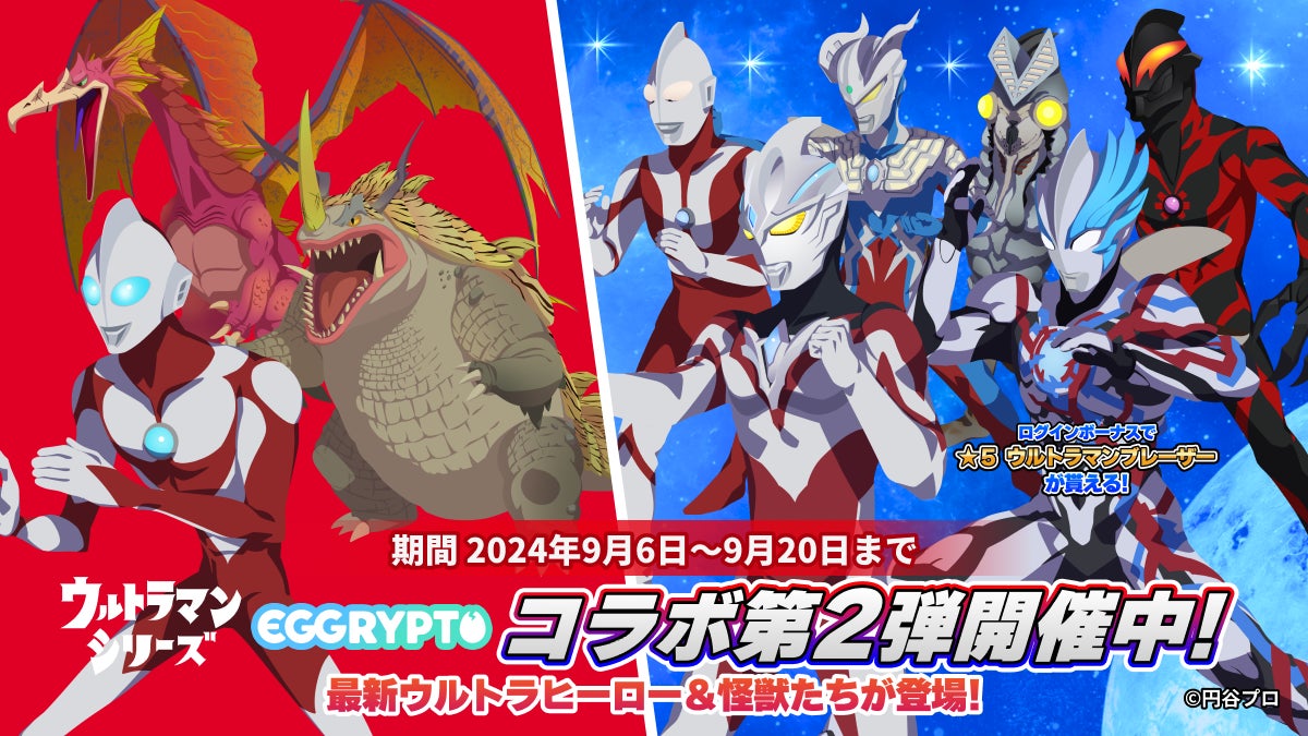 株式会社GameWith(本社:東京都港区、代表取締役社長:今泉卓也、以下「GameWith」)は、出資先であり事業パートナーである株式会社Kyuzan(本社:東京都渋谷区、代表取締役:髙橋 卓巳、以下「Kyuzan」)と共同開発した、アプリで簡単に遊べるNFTゲーム「EGGRYPTO(エグリプト)」において、「ウルトラマンシリーズ」とのコラボイベント第2弾を本日9月6日(金)より開催いたします。