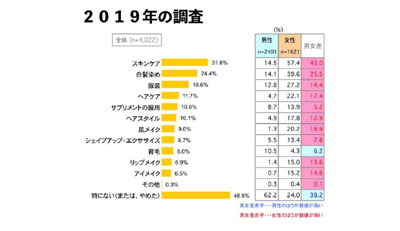 まず、「若々しい見た目を保つためやアンチエイジングのために、気をつかっていること」を聞くと、「白髪染め」と答えた人は27.9%でした(図表1左)。2019年の同様の質問では「白髪染め」をしていると答えた人が24.4%だったので、増加しています。