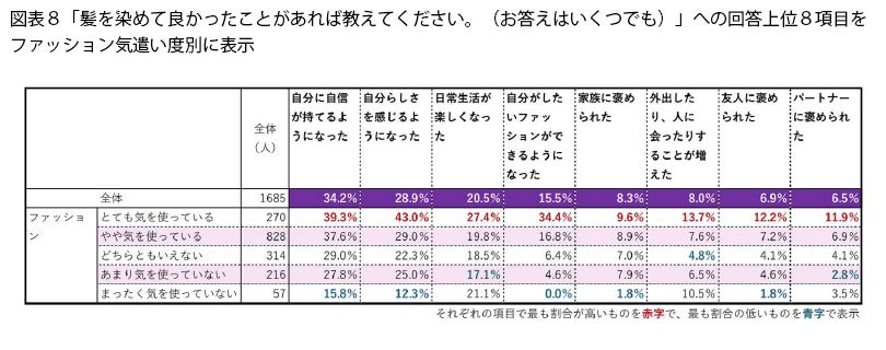 図表7では、項目ごとに男女それぞれで、最も割合が高い世代を赤字にしています。男性・30代では、髪を染めている人は少ないのですが(母数71のうち、14人)、多くの項目で男性・30代の割合が高くなっています。あまり染めている人がいないなかで、思い切って染めたからこそ、満足度が高くなっているのかもしれません。