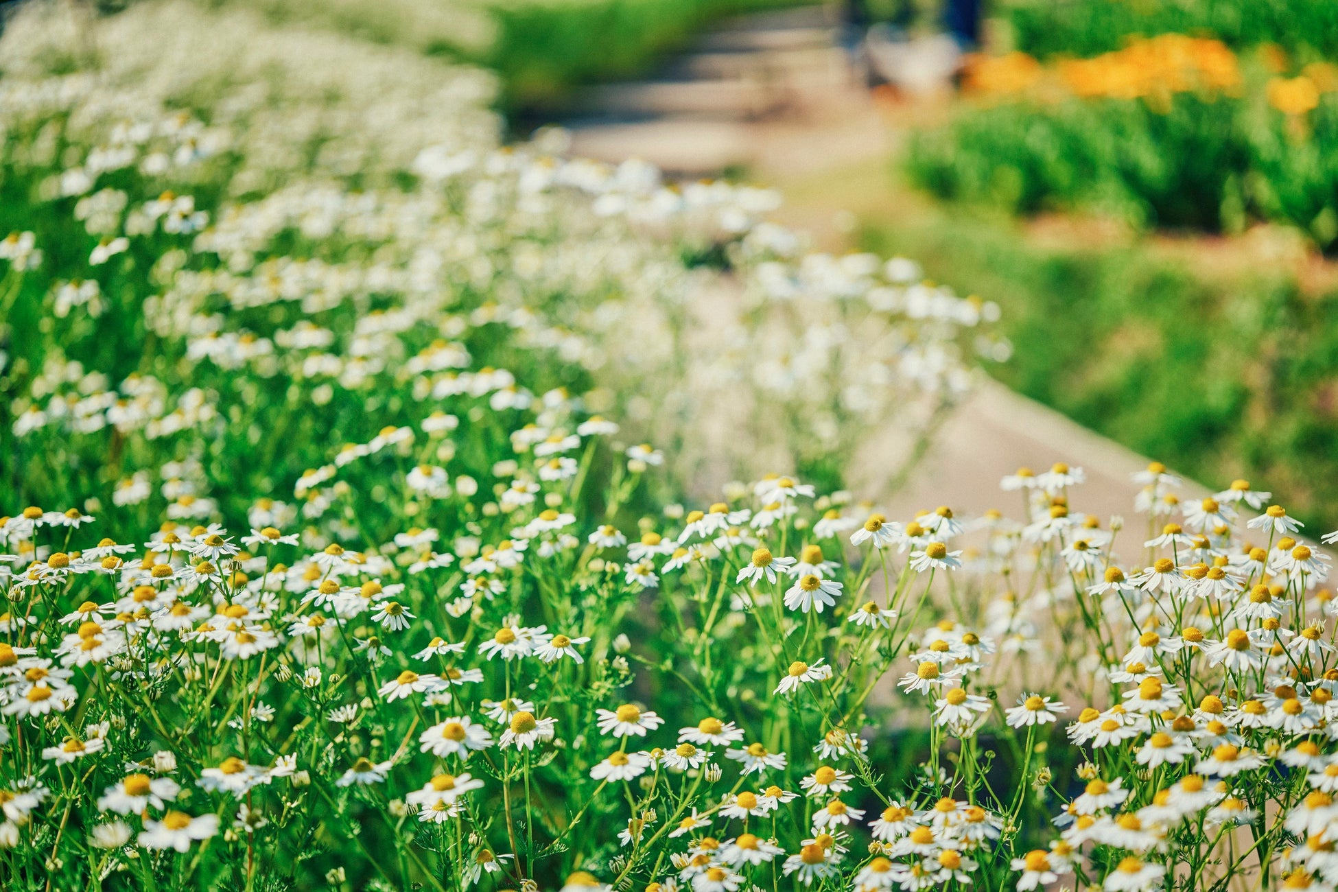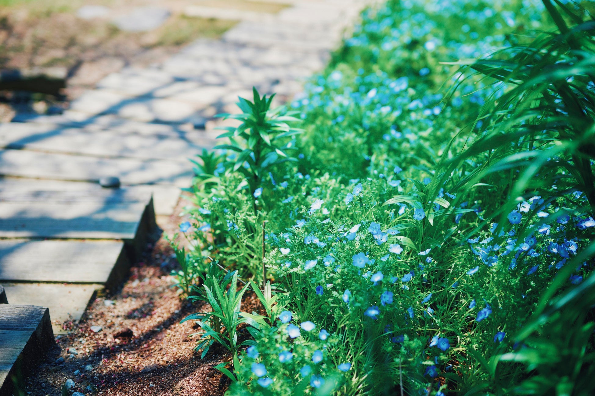 爽やかなブルーの風景が広がる「ネモフィラ」のほか鮮やかなオレンジ色の「ポットマリーゴールド」、触れると甘いリンゴの様な香りがする「カモミール」など色とりどりのハーブや花々が各所でお迎えします