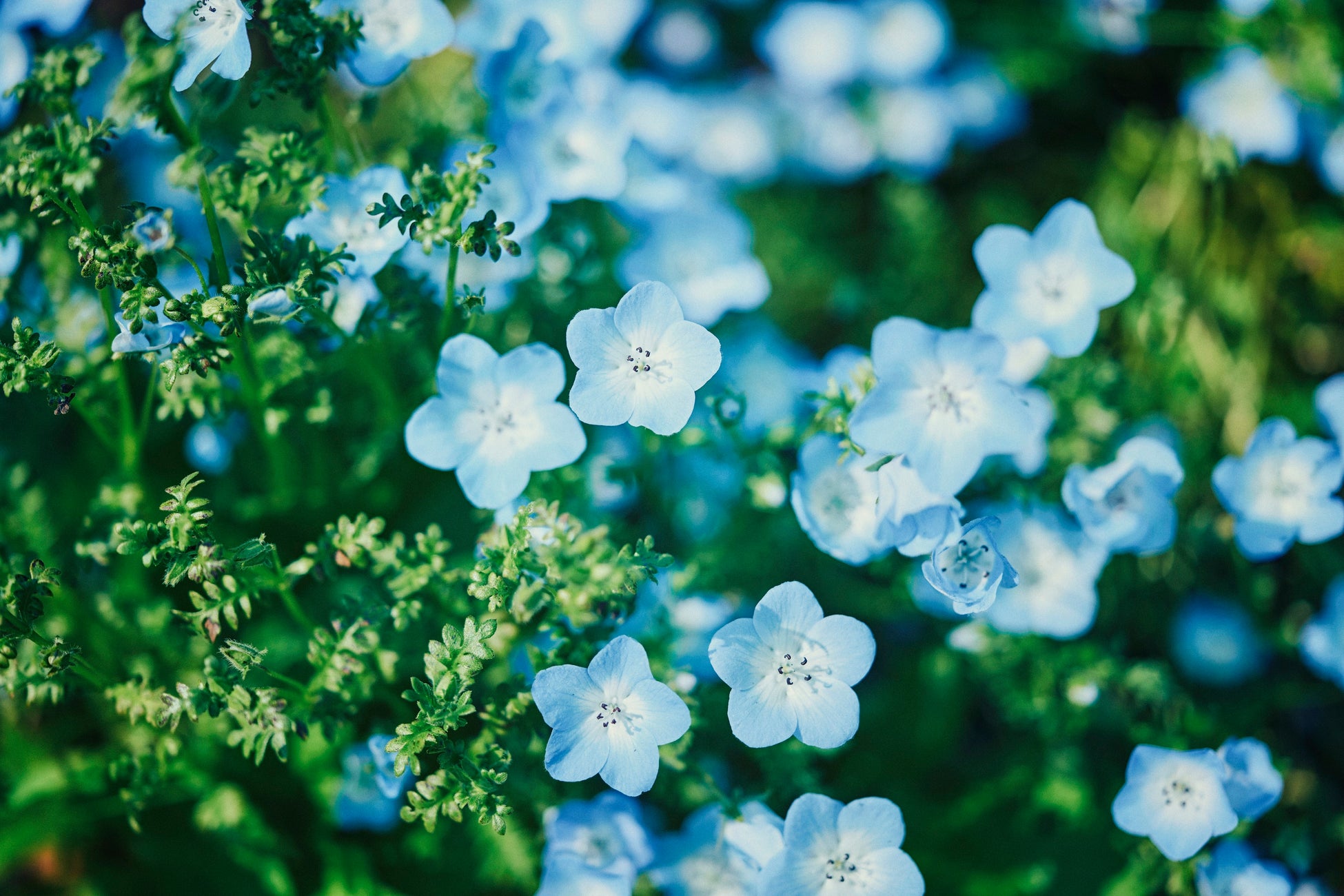 青一面の「ネモフィラ畑」が間もなく見ごろです。ネモフィラ畑の中のハンモックで優雅にひと休み。一面に広がる淡いブルーの絨毯(花畑)に設置されている「ハンモック」や「ベンチ」は期間限定の大人気スポットです