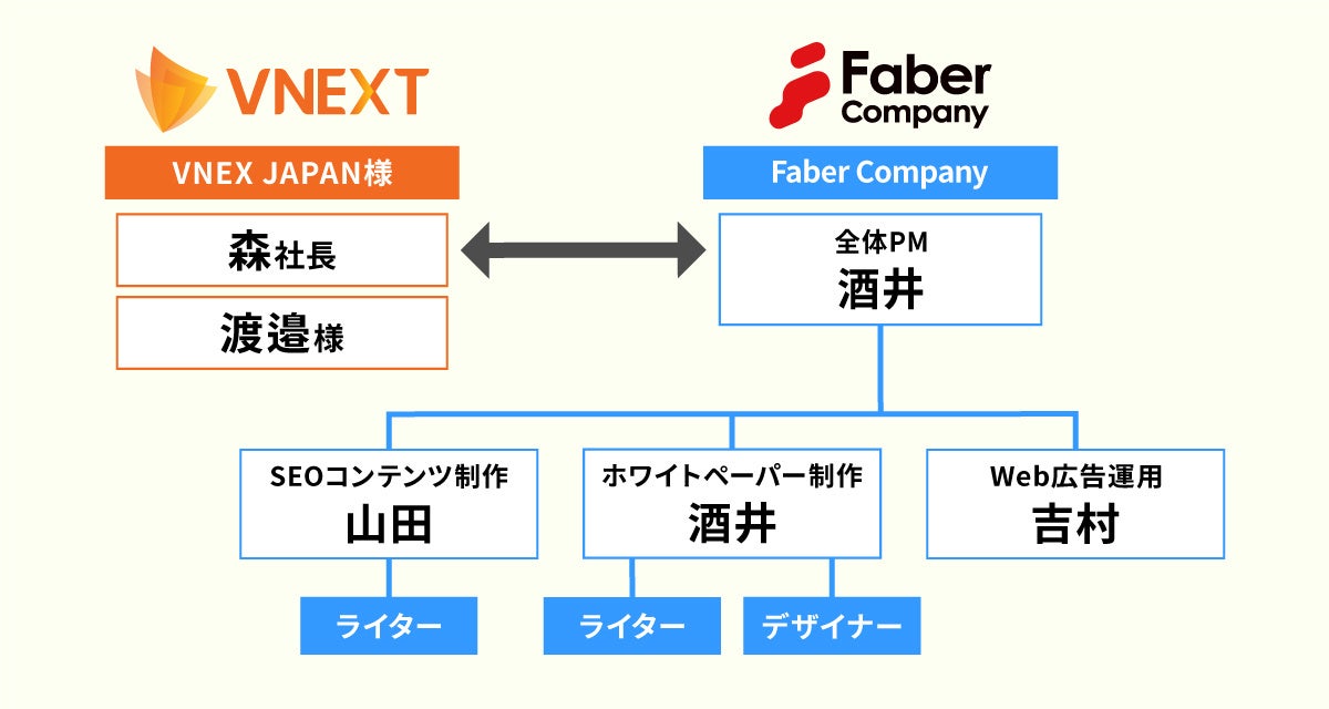 導入後、伴走パートナーとしてのPM(プロジェクトマネージャー)がマーケティング活動全体をサポートしながら、ホワイトペーパー制作・SEO記事・広告運用の各施策ごとに、それぞれ実績の豊富な人材を担当につけ、施策を実行。