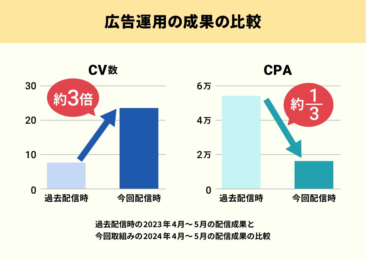 リスティング広告は始めて1か月ほどですが、しっかりとCVが生まれCPAも期待通りの結果に。過去、リスティング広告を出稿していた時と比べ、同じ予算でCV数は約3倍、CPAは1/3の成果改善となっています。