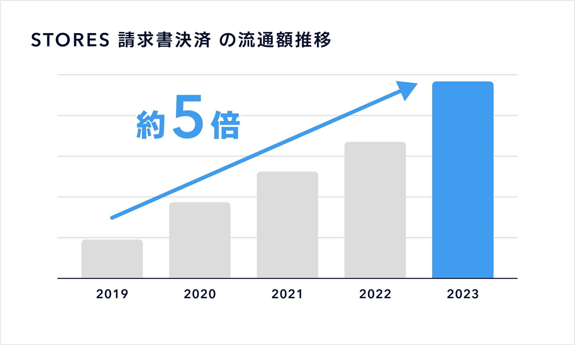 昨今のキャッシュレス決済の浸透に加え、手軽な請求手段として導入数が増加したことから、STORES 請求書決済 の年間流通総額は、2019年から2023年にかけて約5倍(※2)に伸びました。
