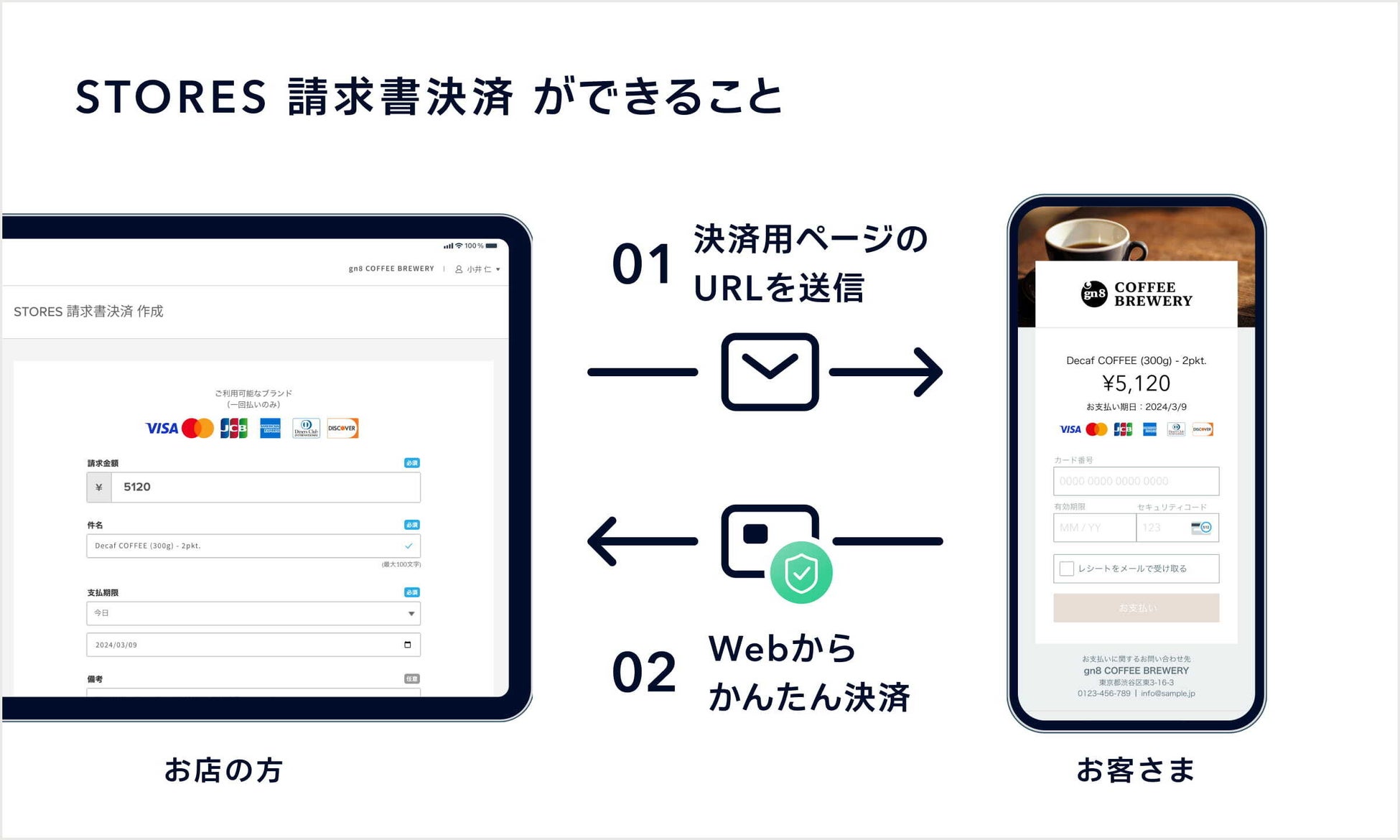 STORES 請求書決済 は、オンラインで簡単に請求ページがつくれるサービスです。請求ページを作成しURLをお客さまに送信、カード情報を入力いただくだけで決済が完了でき、手軽にご利用いただける決済サービスです。遠方のお客さまへの請求や銀行振込の代替としてなど、様々な決済シーンでご利用いただいています。