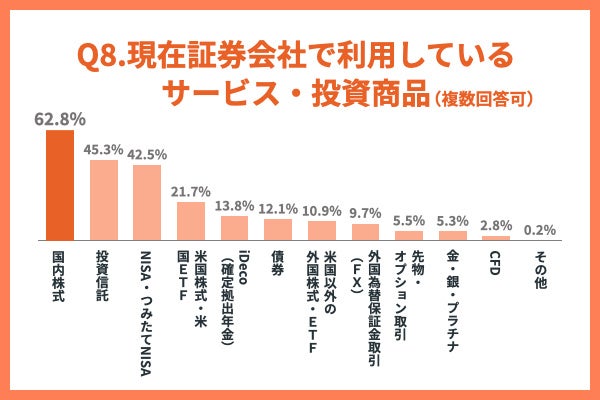 証券会社で利用しているサービス・投資商品では「国内株式(62.8%)」が最も多く、次は「投資信託(45.3%)」が多いという結果でした。