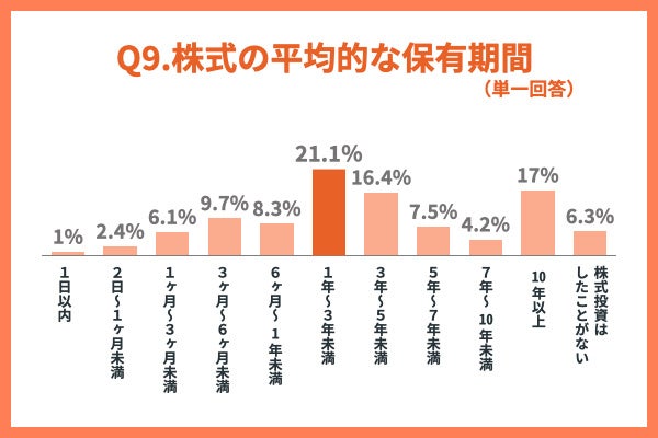 株式の保有期間の長さで最も多い回答が「1年~3年未満(21.1%)」で、次に多いのが「10年以上(17%)」という結果になりました。