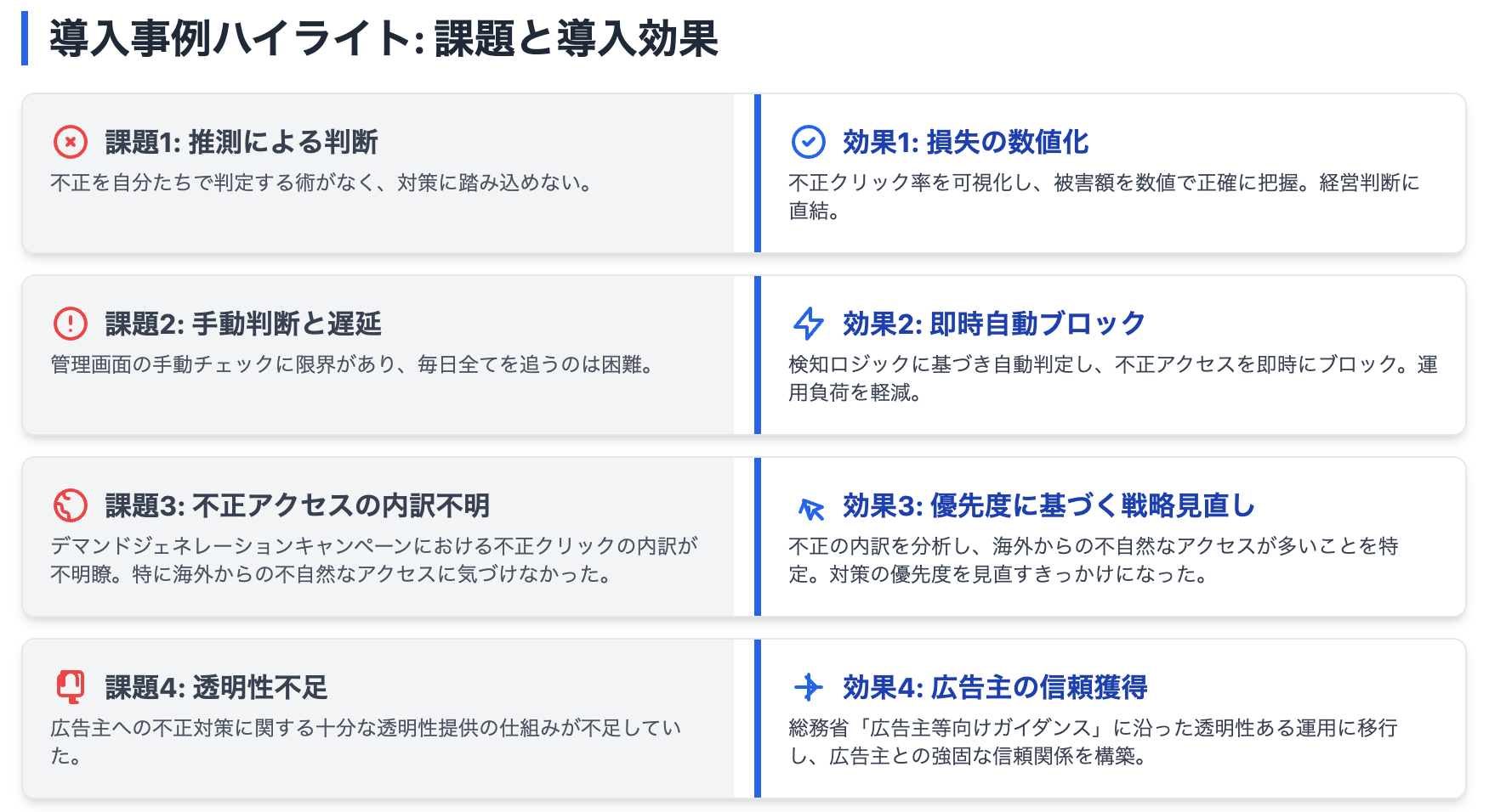 このような背景に加え、総務省の「広告主等向けガイダンス」により広告主にも不正抑止と透明性確保が求められる中、同社は Spider AF のトライアルを実施。不正クリックが“想定以上”に発生していることが数値で可視化され、導入が決定しました。