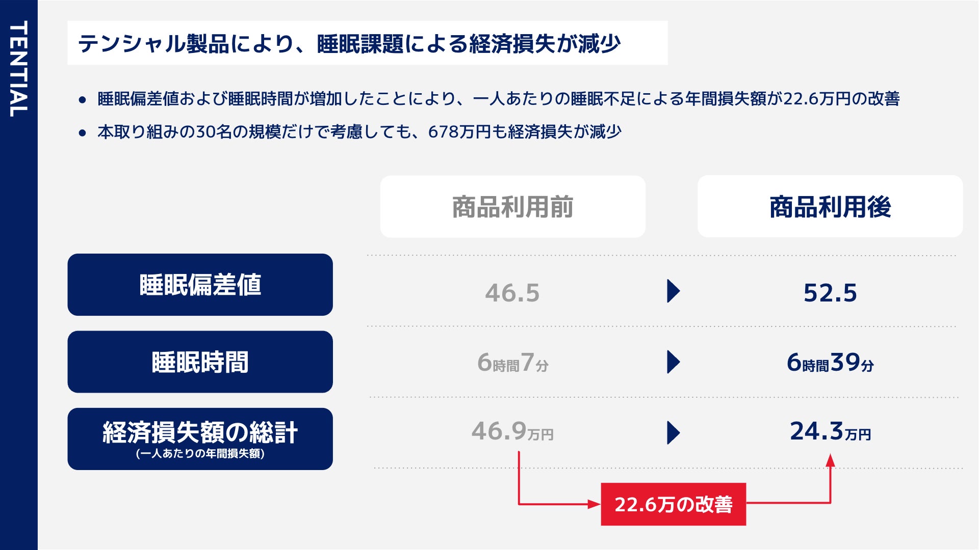 続いて、睡眠偏差値、睡眠時間を元にした経済損失額の変化についてです。テンシャル製品使用前は1従業員あたり年間46.9万円の損失だったものが、商品使用後には24.3万円まで減少したことから、睡眠不足により1従業員あたりの経済損失を22.6万円改善いたしました。本検証は30名という小規模な検証であるにも関わらず、合計で678万円の経済損失を削減をしたことになります。※1