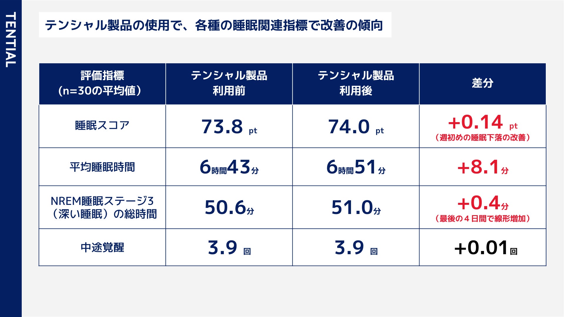 今回の実証を通じて、弊社社員による測定の結果、参考値ではあるのものの非常に良い結果が出ました。実際に検証に参加した方々は飲食制限や睡眠時間等の制限などは実施せず、いつも通りの生活の中でTENTIAL製品を利用していただくことでより実態に近い結果です。参加者からも今後も利用したい、家族分も購入するなどコメントをいただいております。