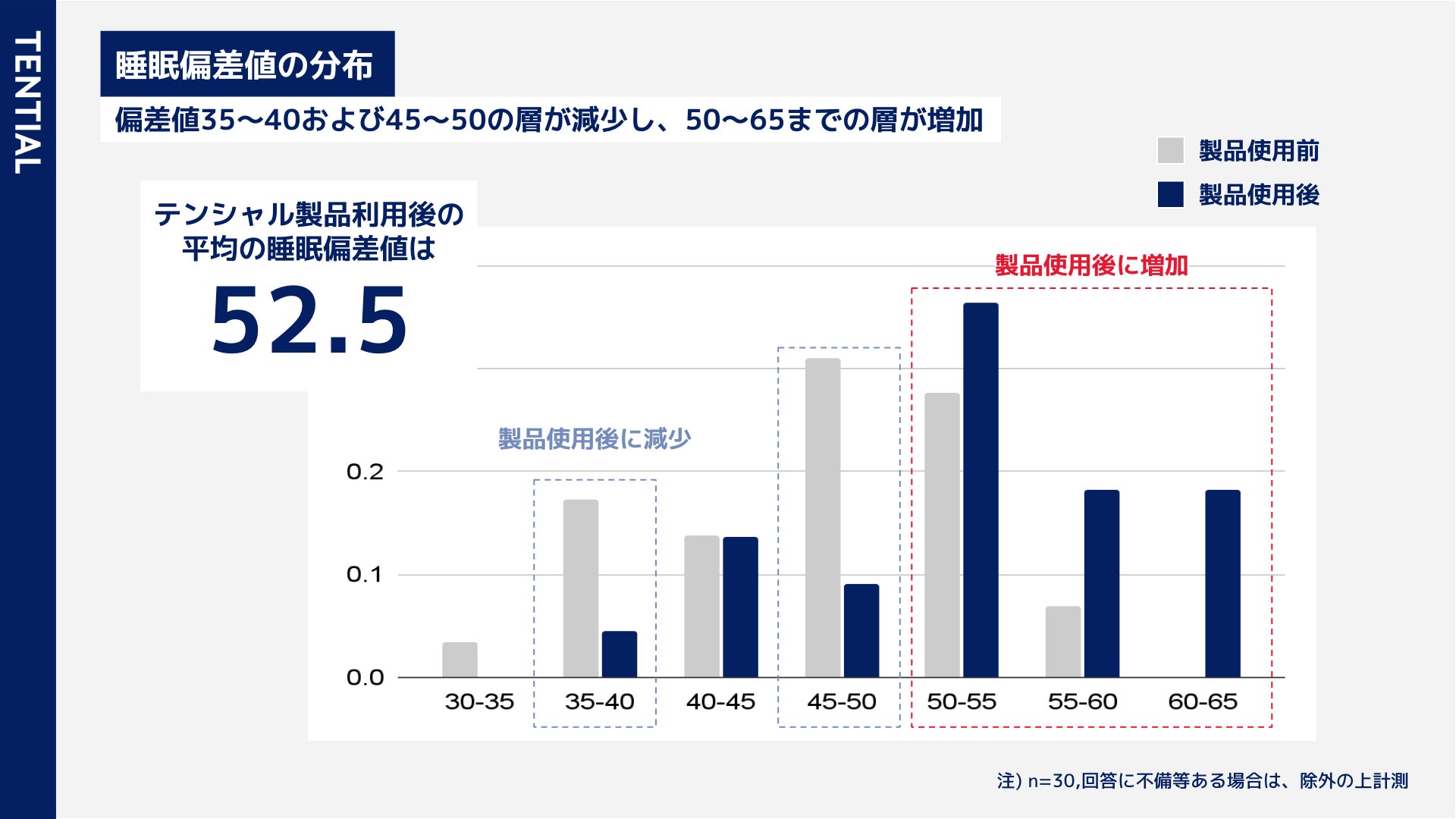 検証の結果、テンシャル製品の使用により、主観的評価において「睡眠偏差値」「睡眠の質」がそれぞれ+6.0 pts、+3.8 pts 改善し、全国平均を上回る結果となりました。また、日中の活動の指標となる「日中の眠気」「日中生産性」「ストレス・モチベーション」の項目においても、テンシャル製品使用によりスコアが向上しました。睡眠偏差値をより詳細に分析すると、テンシャル製品の使用により、睡眠偏差値35-40と45-50の従業員の人数が大幅に減少し、睡眠偏差値の全国平均である50を上回る偏差値50-65の従業員の数が増大していることが明らかとなりました。睡眠スコアおよび睡眠偏差値の大幅な改善は、睡眠時間の改善(テンシャル製品の使用により+30分増大)の寄与がある一方、睡眠の質も変化した可能性も考えられます。