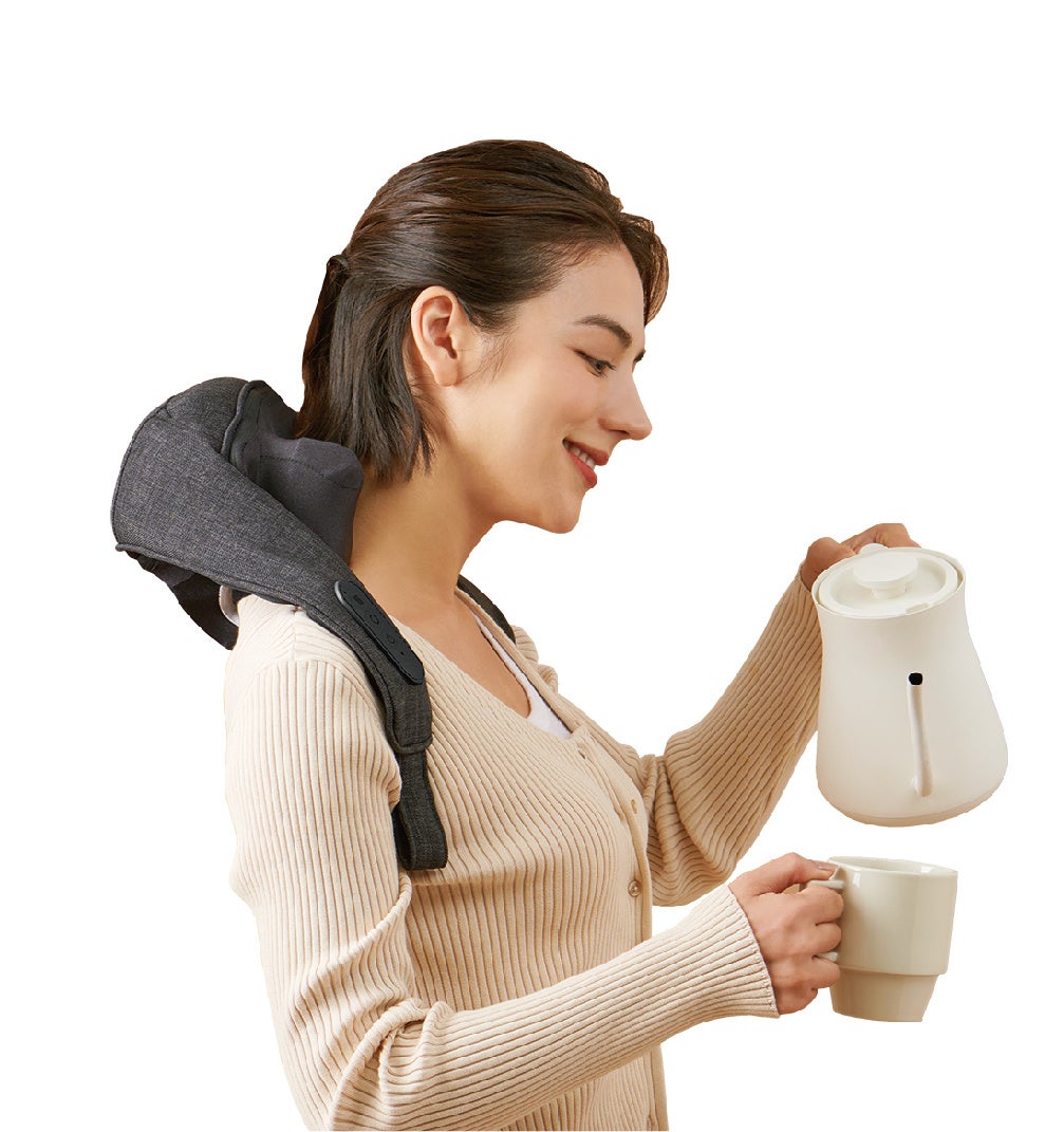 多くのネックマッサージャーはベルトを両手で持つということが一般的ですが、「手が疲れる」「手がふさがってしまう」といったユーザーの声を聴き、開発に挑みました。本製品は体に固定することで手が自由になり、スマホなどの操作はもちろん、ちょっとした作業もマッサージを中断することなく使えます。また、もみ玉の構造も新たに考え、大きく張り出したもみ玉が首筋を捉えながら、肩口を掴む立体的なマッサージは驚きのもみ心地です。マッサージをより手軽に、日々忙しい方へ向けた提案です。