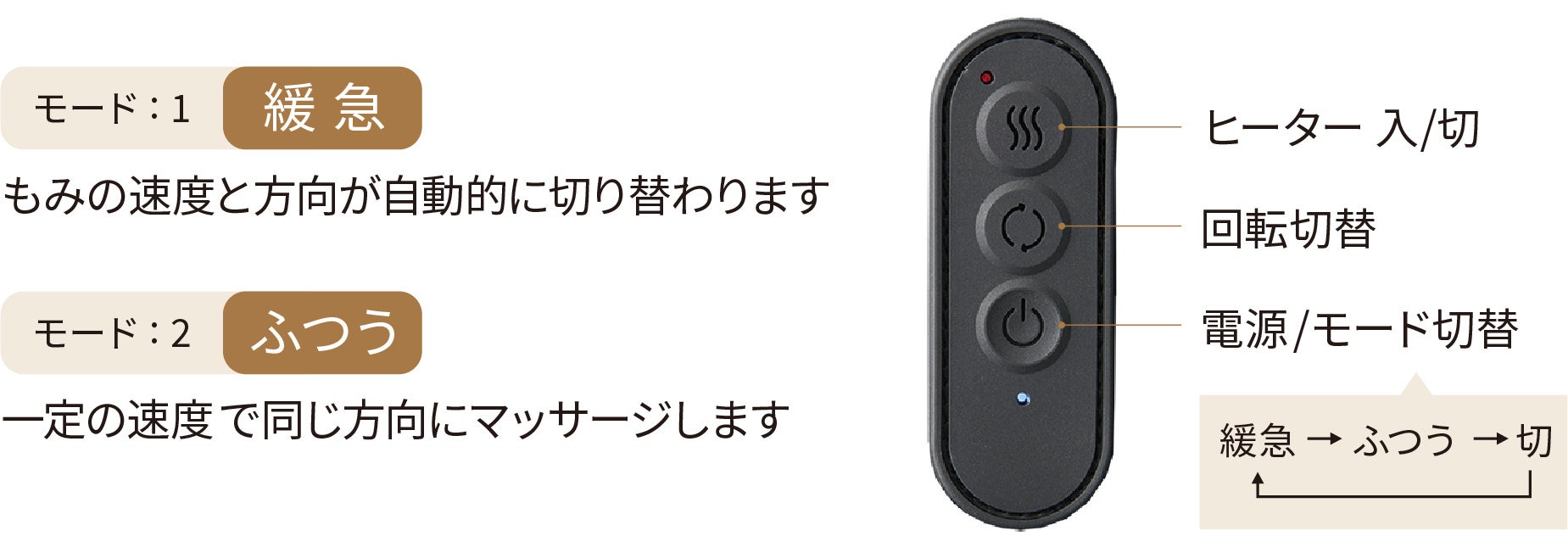 もみ速度ともみ方向が自動的に切り替わる「緩急モード」と、一定の速度で同じ方向にもむ「ふつうモード」の2つのモードを搭載しました。回転ボタンを押して、もみ方向を変更することができます。