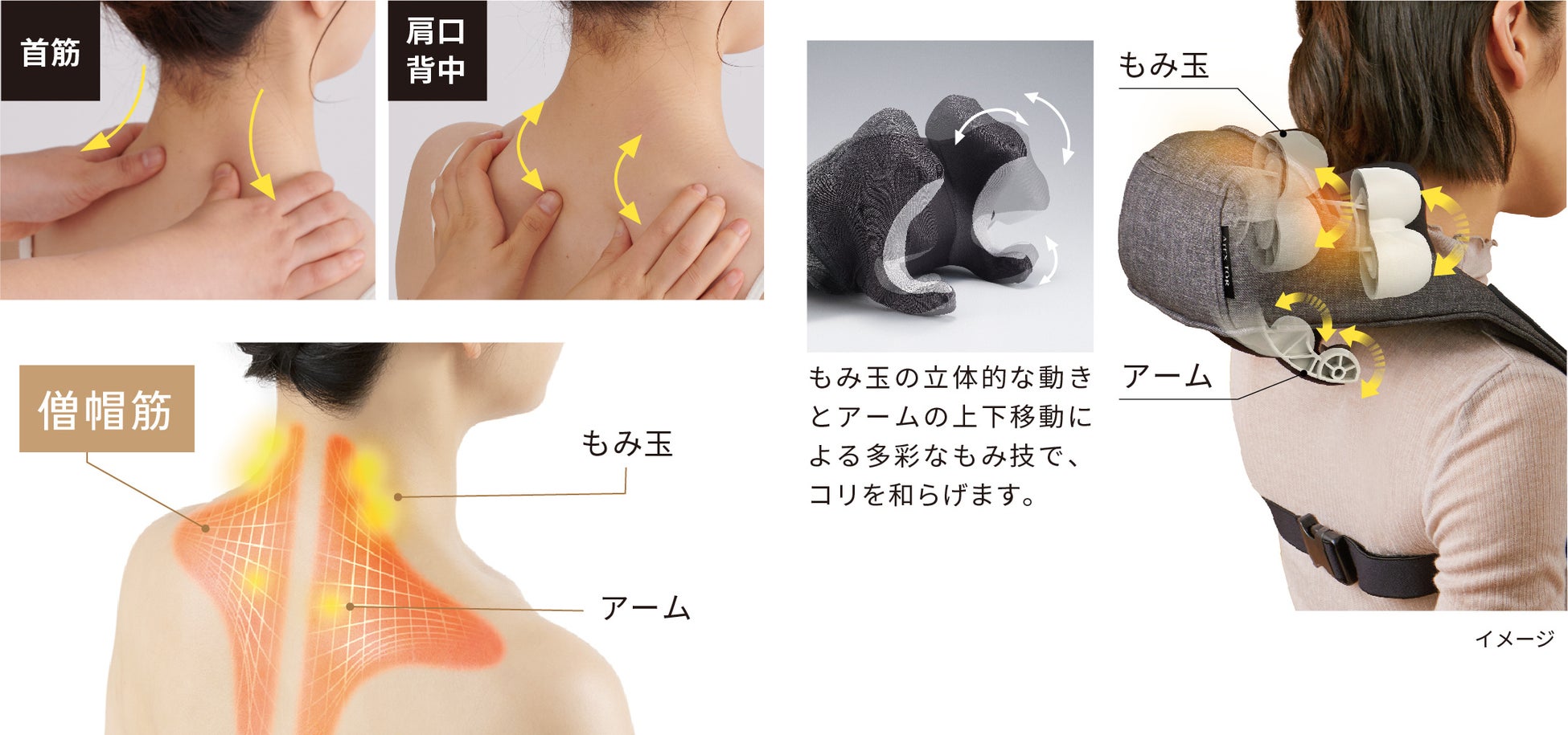 POINT2:僧帽筋(そうぼうきん)をしっかり捉える大型もみ玉とアームで首肩コリを改善