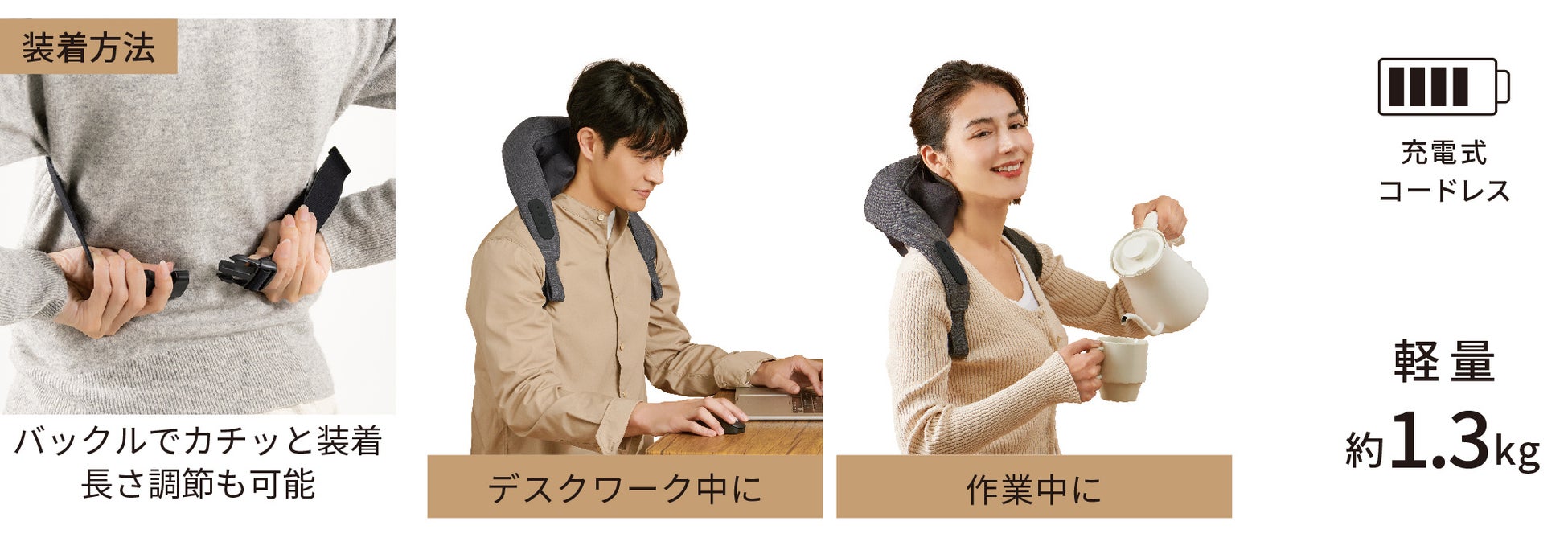 一般的にネックマッサージャーはベルトを手で持つ必要がありました。本製品では体に固定できるベルト式にすることで、両手が自由なままマッサージができます。スマホを見たり、ちょっとした作業中に“ながら”で使えます。また、コードレス式で約1.3kgの軽さで使いやすさを兼ね揃えた仕様です。