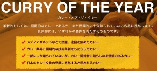 受賞対象は、(株)カレー総合研究所が運営するカレー市民大学「カレー大學」(学長:井上岳久)の卒業生約1000人の自薦・他薦をもとに、書類選考と「カレー・オブ・ザ・イヤー選考委員会」による最終審査を経て、決定されています。