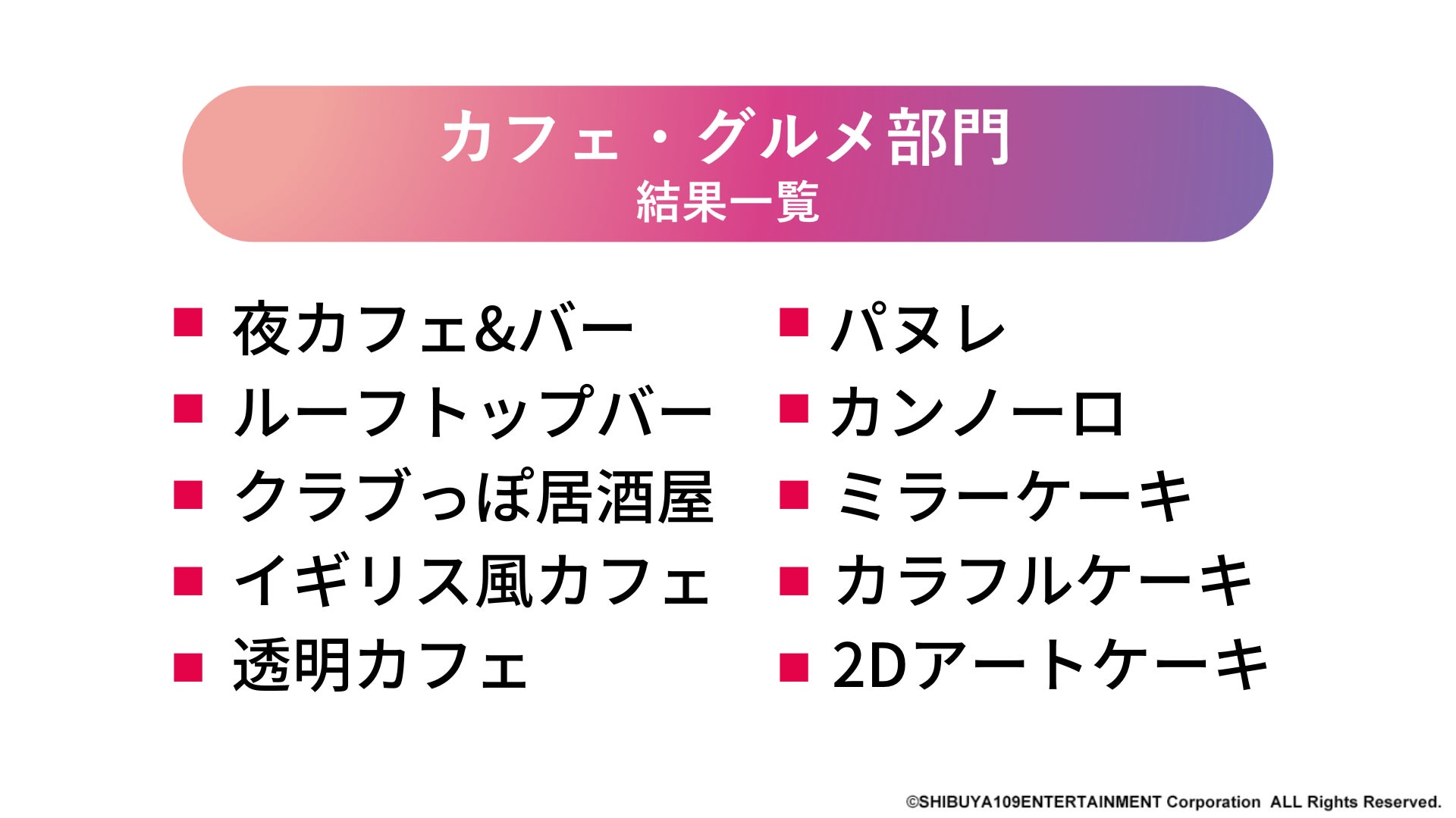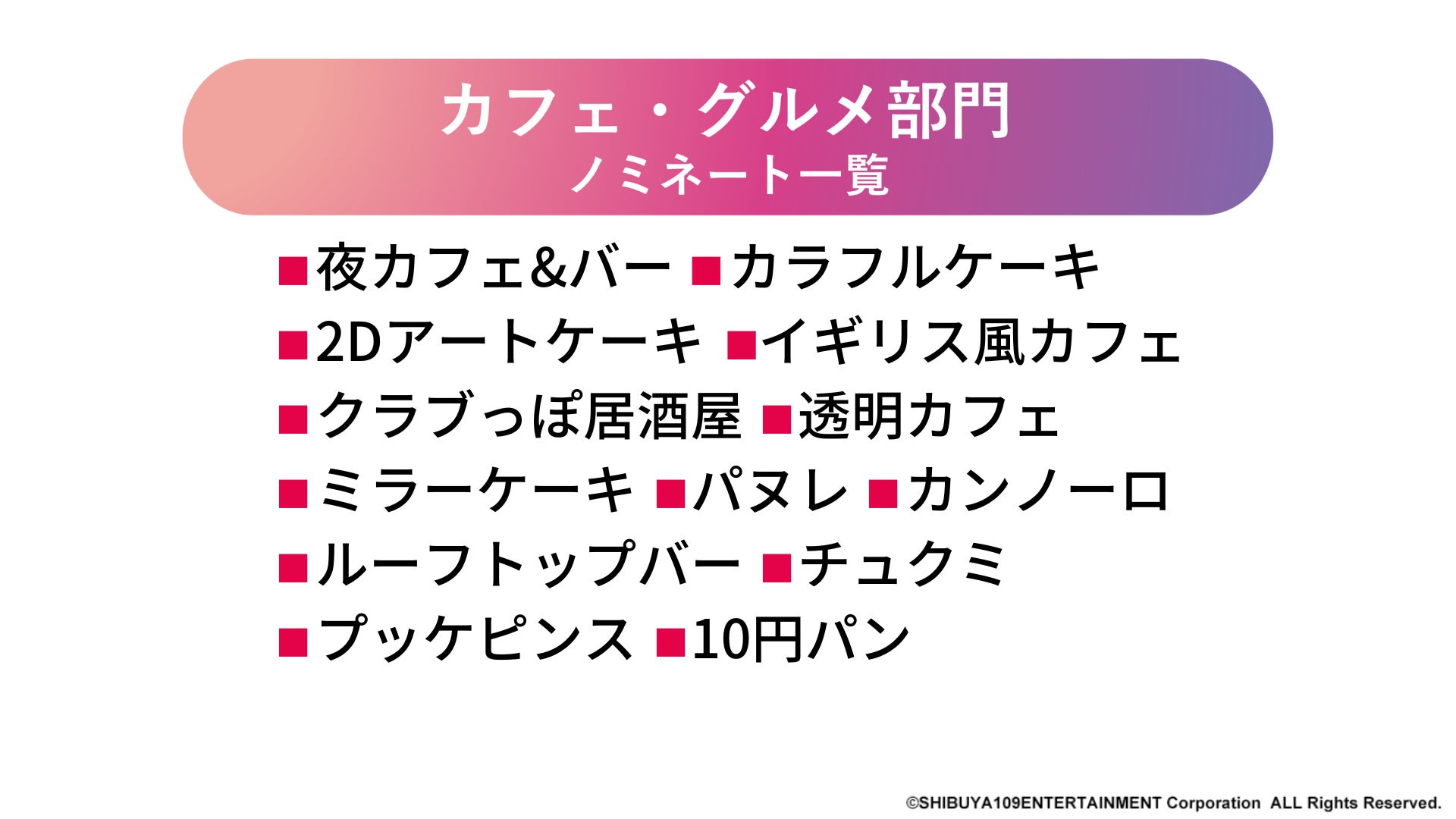 SHIBUYA109 lab.が毎月行う、SHIBUYA109独自ネットワークに属するaround20(15〜24歳)女性へのアンケート調査から、around20注目のトレンドキーワードを計10名の高校生・大学生とSHIBUYA109 lab.が独自にピックアップ。さらに、トレンドキーワードに対してWEBアンケート調査を行い、4部門(カフェ・グルメ部門、モノ・コト部門、ファッション・コスメ部門、アーティスト部門)の中から、票を集めた上位10コンテンツを発表。