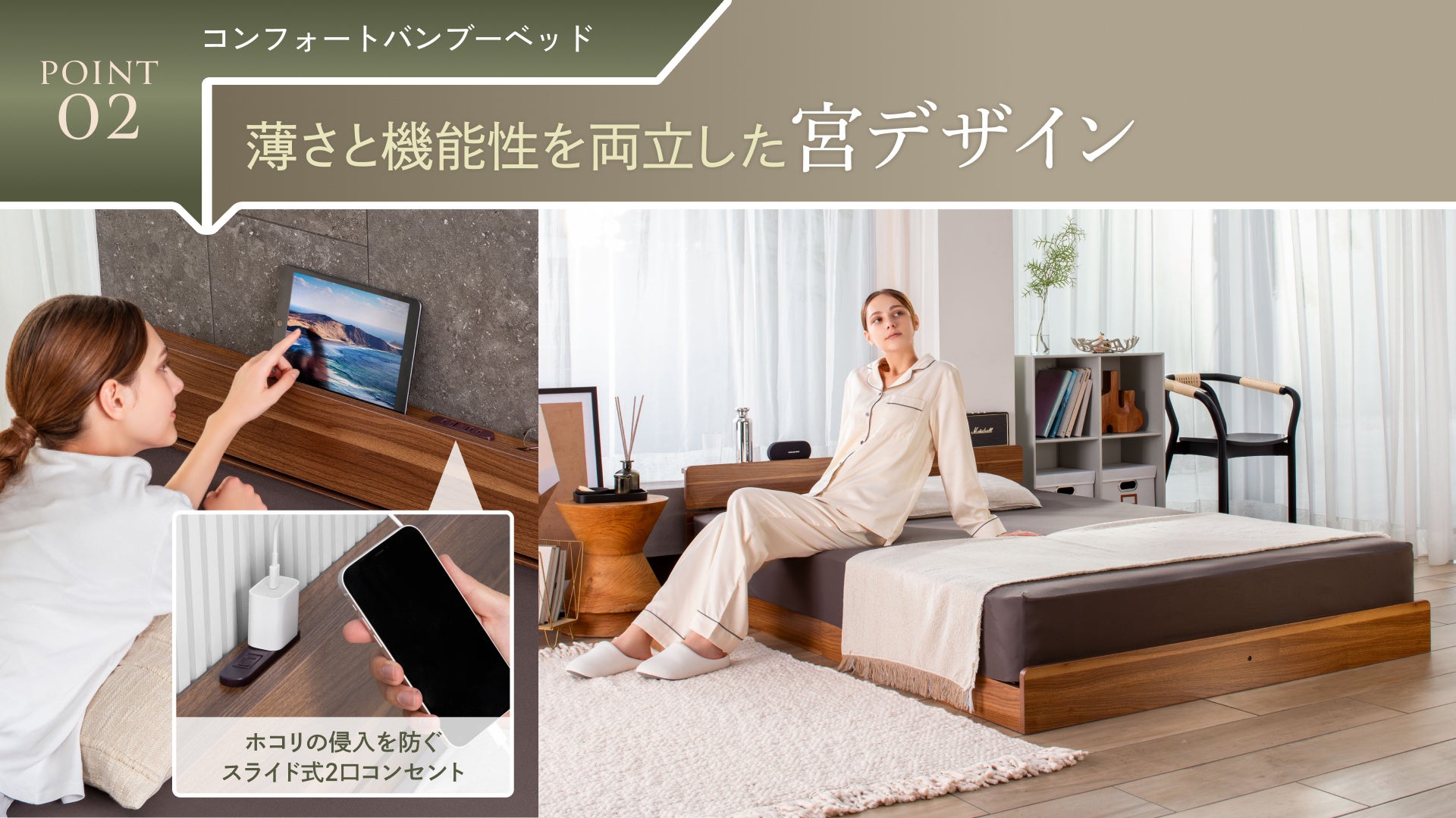 さらに、宮棚には便利なコンセントとLED照明を搭載。スマートフォンやタブレットを枕元で充電できるほか、夜中に目が覚めた際には、やわらかな光が手元を照らし、安心感をもたらします。