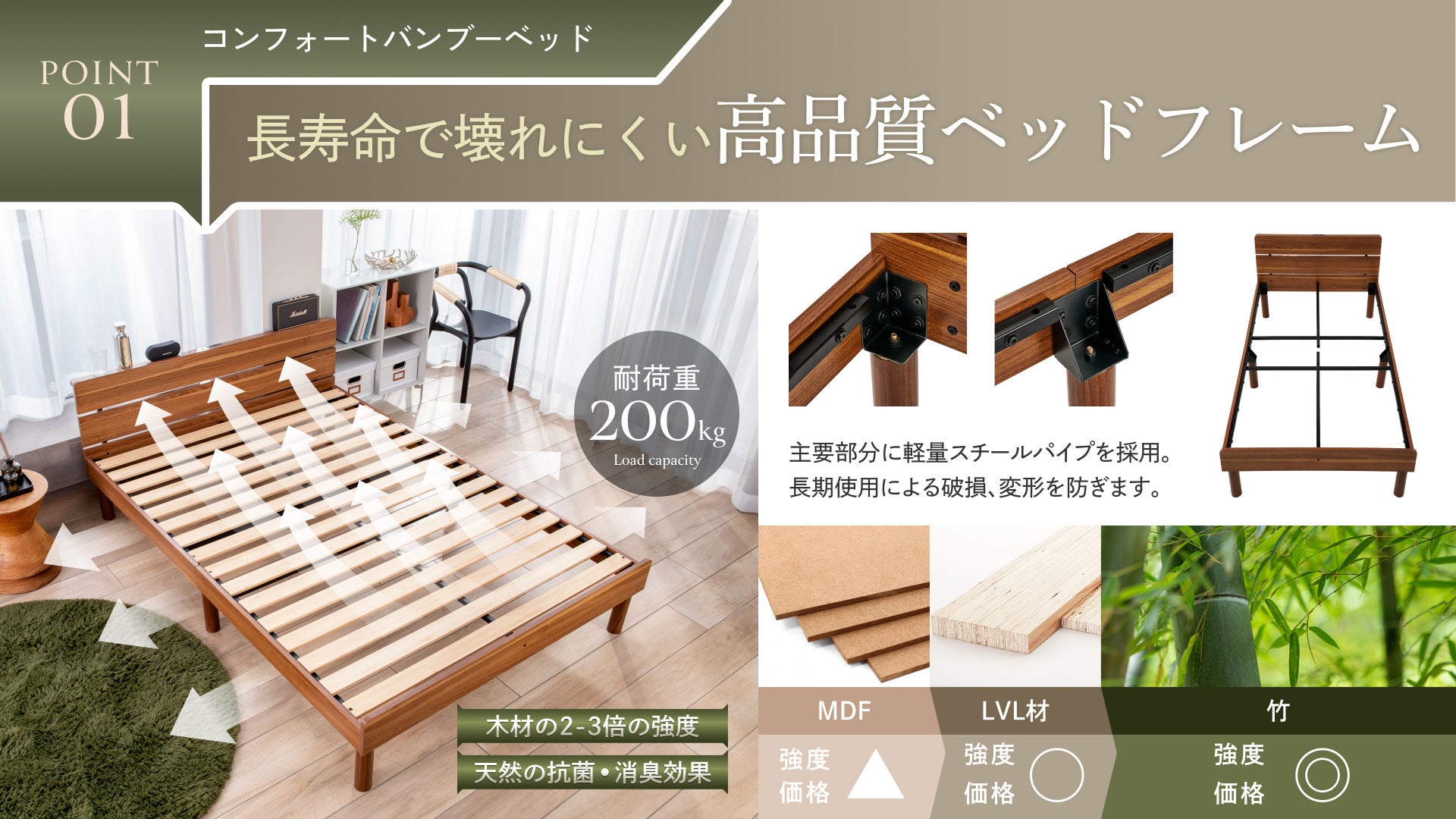 「コンフォートバンブーベッド」は、木材の約2~3倍の強度を持つ竹素材を贅沢に使用。竹特有の弾性と耐久性により、長期間使用しても劣化しにくく、安心してお使いいただけます。また、すのこ構造による優れた通気性と竹の天然抗菌作用が、湿気やカビの発生を抑え、清潔な寝室環境を維持します。さらに、内部構造には高強度かつ軽量なスチールを採用。割れや破損に強く、湿気やカビにも負けない設計で、長く快適にお使いいただけるベッドです。