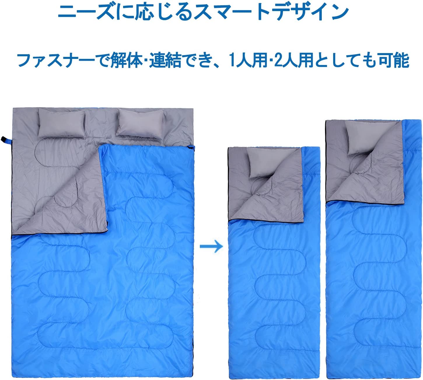 本体サイズは、幅150cm×長さ220㎝で2人用として十分な大きさです。身長180cmの方でも窮屈に感じることなく、快適に過ごすことができます。シュラフ本体は、ファスナーで解体・連結できる仕様になっており、2人用から1人用シュラフとしても使用可能。ソロキャンプを楽しみたい方、家族や友人と一緒に過ごすキャンプにも大活躍する便利な機能です。